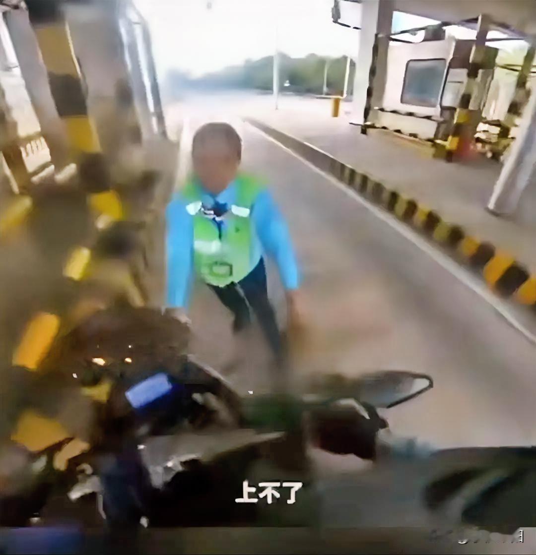 某地收费站内一男子骑摩托车强行上高速,收费员一边用身体阻拦一边告知男子不能上去,