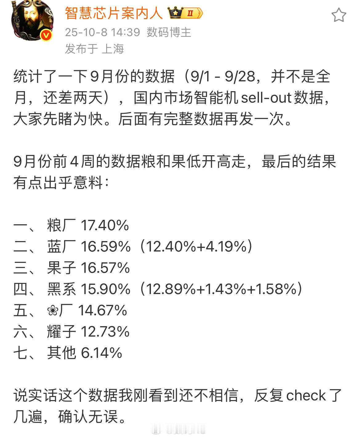 不出意外九月份小米市场份额应该第一稳了,小米17上一周就卖两天就超过了苹果,这还是Pro、Max缺货情况下。