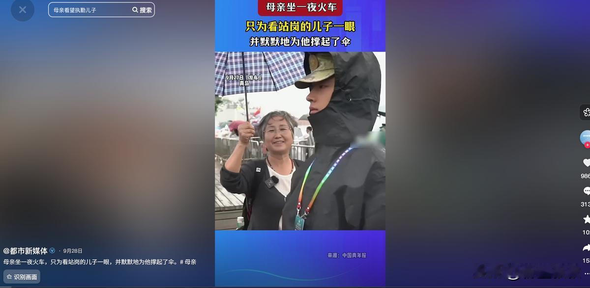 上人民日报了!河南,一位妈妈坐了整整10小时绿皮火车,一路颠簸到青岛去看儿子。谁料,儿子看到妈妈,只是嘴唇动了动,扭头一句话都没说!原来,儿子是一名军人,妈妈得知儿子在海边执勤,就坐夜车赶过来,只为了能看儿子一眼。网友评论说:“你看一眼,心满意足,我看一眼,热泪盈眶,致敬我们最可爱的人!” 你知道不,最近有个事儿上了人民日报,我刷到的时候,没看两行眼睛就有点发潮,河南有位妈妈,为了看一眼在青岛当兵的儿子,愣是坐了整整 10 小时的夜班绿皮火车硬座,一路颠簸过去,结果儿子看见她,就只是嘴唇动了动,扭头继续站在那儿,一句话都没说。 说起来,这位妈妈也是真不容易。出发前,她在老家的厨房里忙了小半天,把儿子最爱吃的酱菜装了满满一玻璃罐,塞在背包最里面,怕路上磕着漏了。她那手机还是前年换的,边角都磨得发亮,屏保却一直是儿子去年探亲时拍的照片,穿着军装笑得特精神,她一路上掏出来看了好几回,越看越盼着赶紧见到人。 绿皮火车慢夜班车上人不算少,座位硬邦邦的,10 个小时下来,她的腰都直不起来,腿也麻得厉害,中途就靠在窗边眯了一会儿,醒了又盯着窗外的夜色发呆,满脑子都是儿子小时候的样子,想着这次见了面,得好好看看儿子瘦没瘦、黑没黑。 终于到了青岛下了火车又转了两趟公交,才摸到儿子执勤的海边,那天还下着雨不大但密,打在身上凉丝丝的,她远远就看见一群穿军装的小伙子站在那儿,笔挺得像棵棵小白杨,一眼就认出了最中间那个,是她的儿子比照片里看着更结实了,就是脸晒得更黑了。 她赶紧加快脚步跑过去,手里还攥着那把折叠伞,生怕儿子淋着雨,跑到跟前她踮着脚,想把伞整个罩在儿子头顶上,自己的半边肩膀都露在雨里,头发很快就湿了一绺贴在脸上。 她张了张嘴,本来有一肚子话想说,比如 “路上挺顺的”“给你带了酱菜”,可最后就只轻轻说了句 “妈就看你一眼”。 儿子其实早就看见她了,从她出现在路口的时候,他的喉结就悄悄滚了一下,眼眶也有点发热,他想喊一声 “妈”,嘴唇都动了动,可脚像钉在地上似的,半点都挪不开,他穿着军装正在执勤,纪律就像刻在骨子里的规矩,不能随便说话,更不能离岗。 就那么一秒钟他迅速把头扭了回去,目光重新落在远方的海平面上,后背挺得更直了,连攥着拳头的指节都泛了白,旁边路过的游客看不过去,小声问这位妈妈:“这是你儿子啊?怎么不跟你说说话?” 妈妈赶紧抹了下眼角,笑着跟人家说:“俺儿是军人在岗上呢,这军姿多正俺看着就骄傲。” 雨还在下妈妈就站在离儿子不远的地方,撑着伞静静地看着他的背影,她没再多说一句话,也没再靠近一步,就那么看了大概十几分钟,直到儿子换岗的间隙,偷偷用眼神跟她示意了一下,她才放心地慢慢往后退,一步三回头地离开了海边。 后来有人把这一幕拍了下来,发到网上没多久就被《人民日报》转载了,评论区里好多人都看哭了,有人说 “妈妈看儿子那一眼,满是心疼;儿子扭头那一下,全是责任”,还有那句评论说得最戳心:“你看一眼,心满意足,我看一眼,热泪盈眶,致敬我们最可爱的人!” 那位妈妈后来坐火车回老家,背包里的酱菜没送出去,可她一点都不觉得遗憾,跟邻里街坊说起这事,还总笑着说:“俺儿在青岛好好的,站在那儿跟个小铁塔似的,俺放心,” 你看这就是军人的妈妈,心里有牵挂更有对孩子责任的理解,这份朴素的爱比啥都动人。 (信息来源:都市新媒体)