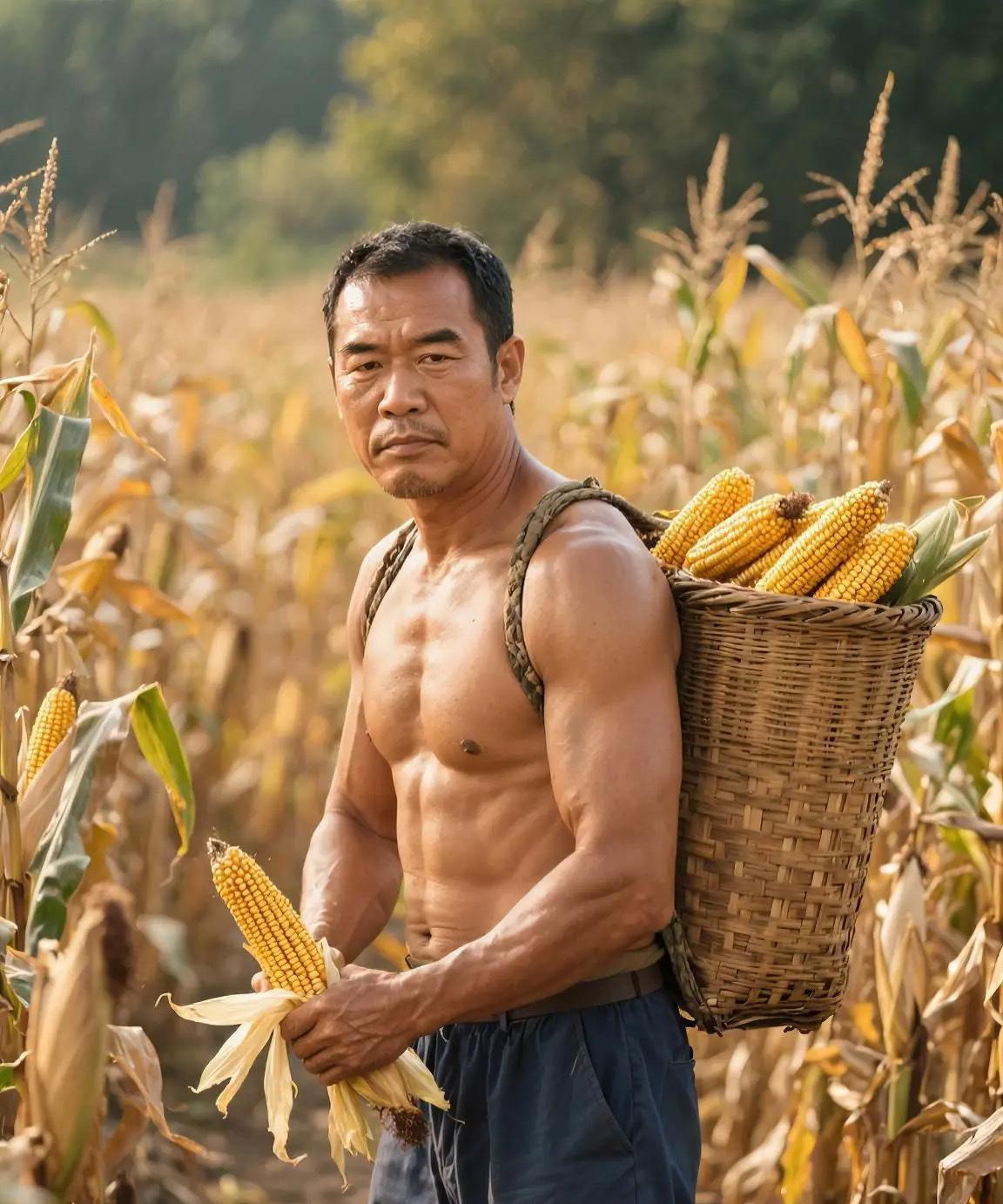 《黄河岸边的汉子》 黄河岸畔一壮汉,玉米垄中汗珠串。 肩驮竹篓金苞漫,手把玉茭豪