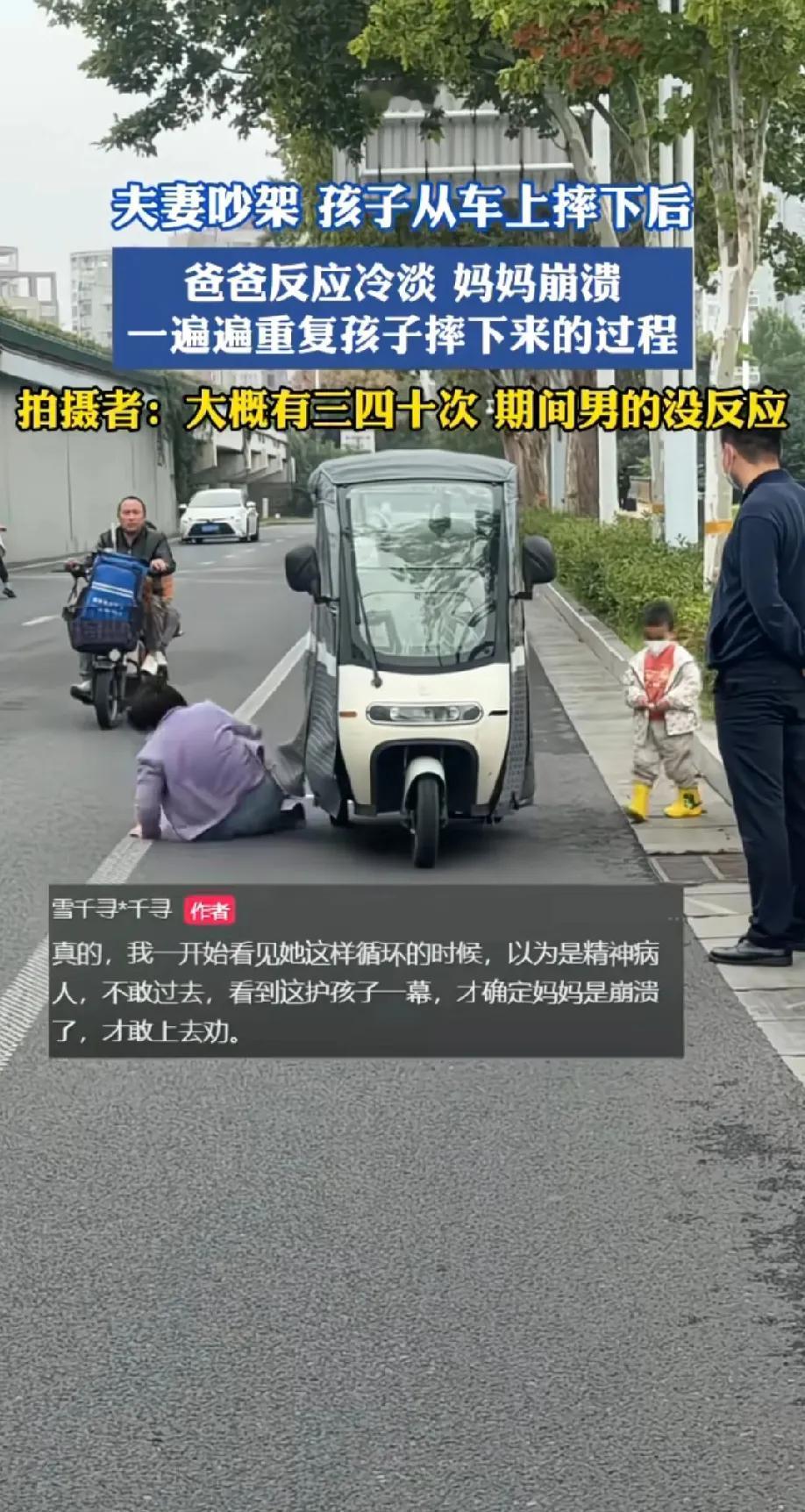 女人是永远叫不醒一个装睡的男人 河南一夫妻吵架,孩子从车上摔下来后 妈妈一遍遍重复孩子摔下来的过程,估计有3、40次,爸爸反应冷淡,就站那看。 女的真的是崩溃到神经都不正常了,可怜又可怕了!关键自己一次次摔,一次次演,那男的就跟冷血动物似的,情绪一点也波澜都没有,更别提去阻止。也证明这行为绝对不止一次,男的看多了,麻木了,甚至觉得女的有病。 孩子还那么小,一次次演,要亖要活的,得有多大的心理阴影,吓得孩子都不敢动。 何必呢,用别人的错误惩罚自己,不开心,打他一顿,提离婚就好了。这行为除了自己疼,在他眼里就是个笑话。