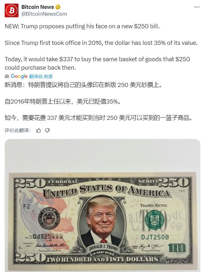 主打一个随意就好! 多家美媒消息:特朗普正式提议将自己的头像印在 250 美元钞票上。 美国博主嘲讽:太好了!当我们达到津巴布韦的通货膨胀水平时,我们可能都会有一些。