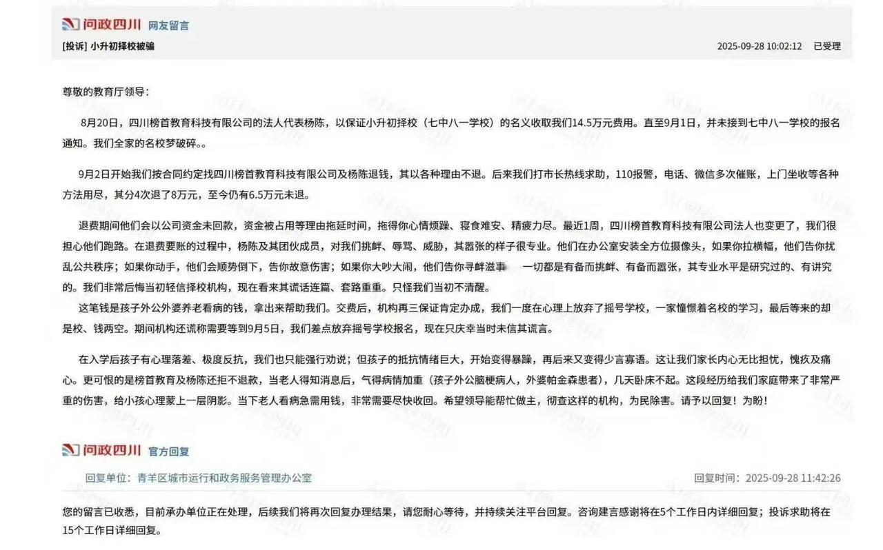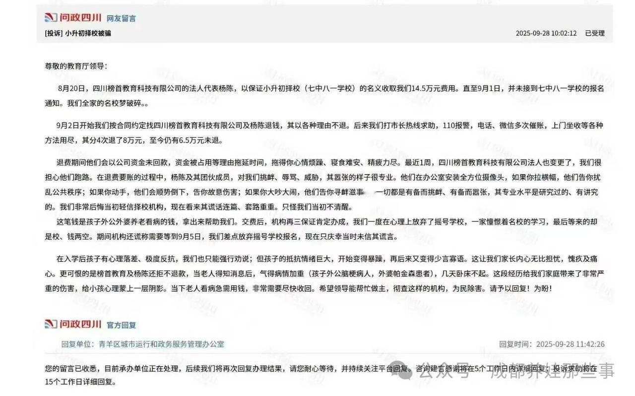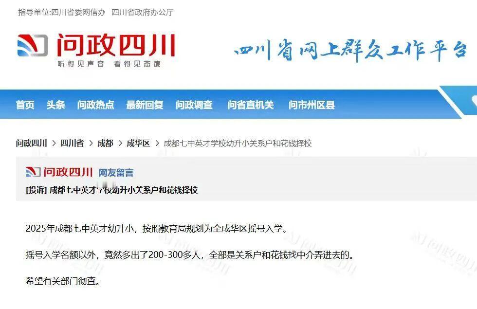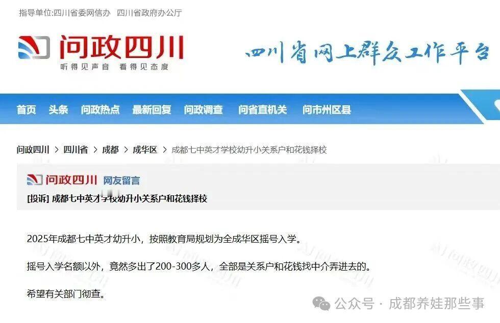 如果非要择校,我只推荐这一种方式 国庆8天,无聊的时候总是忍不住刷手机,看看热闹。 现在小红书没有“问政四川”有料,成都教育的热点好多都来自这里。 开学前后,总是有和择校相关的投诉。 幼升小,小升初,肯定是有择校生的,这不稀奇,各区的很多学校都有, 图一非要到问政四川上来讲, 主要还是因为这个全区摇号的机会太宝贵了,成华区的人又多, 成华家长维权意识算强的,不晓得这个后续如何? 虽然,但是。 择校这种潜规则,如果有实力,能够得着的,倒也是你情我愿; 怕就怕,以信息差的名义被收割,被忽悠, 关键介绍人还可能是所谓成功择校的某个同事,某个亲戚, 每年都有,经侦立案也罢,法院起诉也罢, 最后搞得当事人又累又疲,不了了之。 读个书,还没到中高考,先脱层,这没苦硬吃,不值当啊。 就算择进了学校的,成绩跟不走,学校并不会因为择校生身份优待你, 更不划算的是小升初择校生, 为了择校丧失了指标到校资格,要硬拼中考的这个软肋。 如果非要择校,我只推荐一种方式: 避开各种中间人,能直接和学校对话的。 要么是关系够硬,要么是成绩够硬。 多一层中介,多一笔费用,多一层风险。 家长找学校直接投简历,是一种最朴素的方法,性价比最高。 实际一路走来,绝大多的家长还是会选主流的方式, 用最合适的方式托举,这里面有家长的认知判断。 国庆假放完了,我们还是回过神来, 持续给娃的软硬实力添砖加瓦吧!