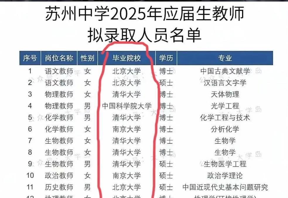 苏州中学果真强悍,很多大学的硕导也难达不到这个标准吧! 之前有个家长咨询某个老师,说她女儿在苏州大学读汉语言文学专业的研究生,问毕业以后能不能去苏州中学当老师。那个老师的回复干脆利落,说简历都进不去苏州中学的门。 从苏州中学教师录取情况不难看出三大问题,一是现在就业形势严峻,二是文科以及生物化学专业就业难,三是师范类专业没有专业壁垒,说以说大学选专业也是一门技术活。