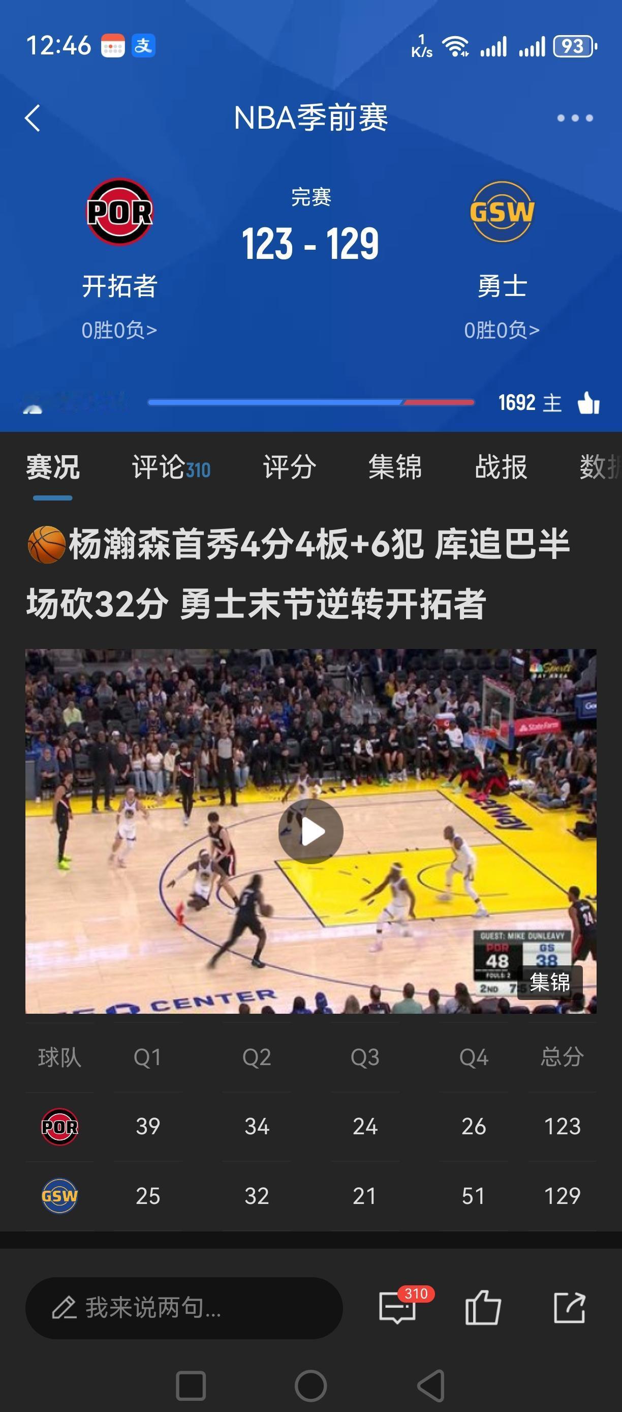 杨瀚森首场季前赛!不出彩但还算合格!4分4篮板1助攻!6犯下场! 开场很紧张,第三四节放松后好多了! 经验和对抗还需提升! 但下限很高,在场上防守,挡拆确实有作用! 当然,组织机会不会很多,新秀不会有很多持球机会。 总的来说表现不出彩,但还合格!继续加油![赞][赞][赞]