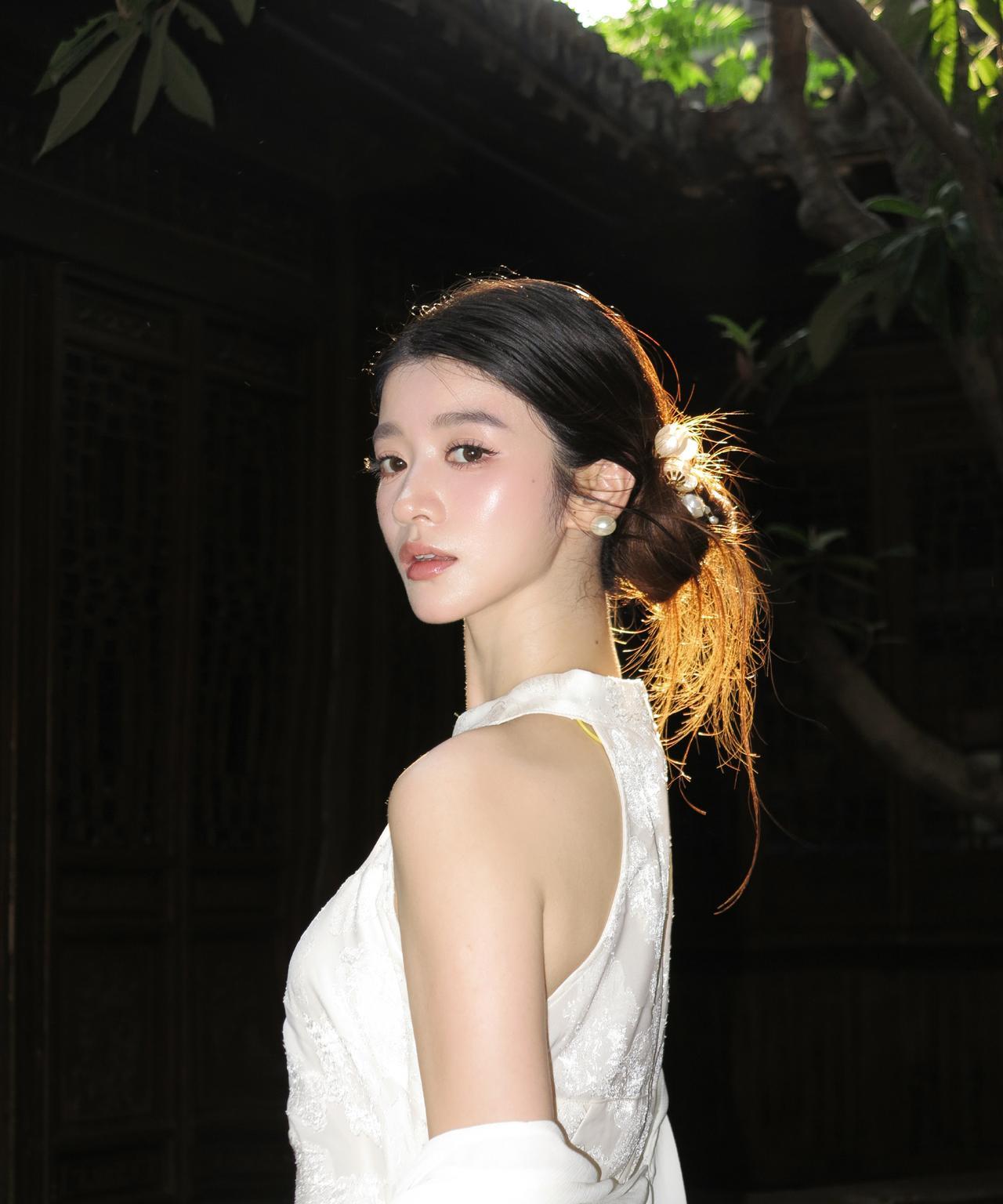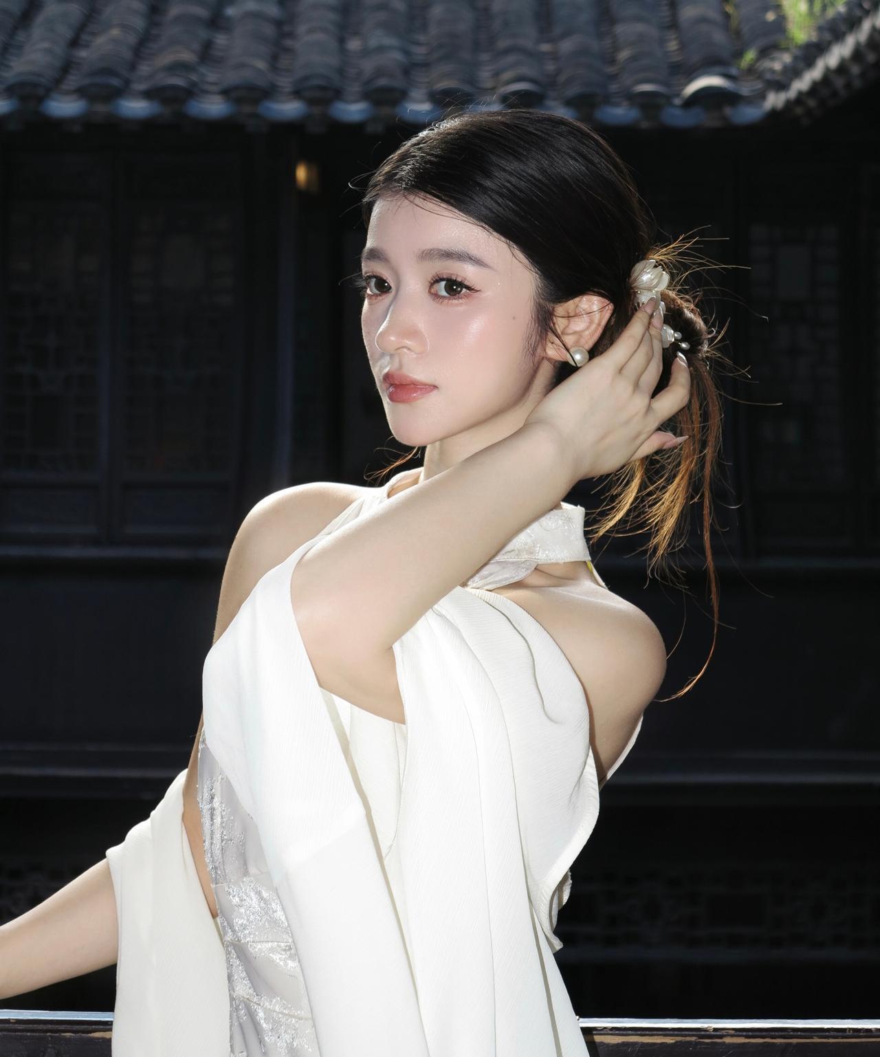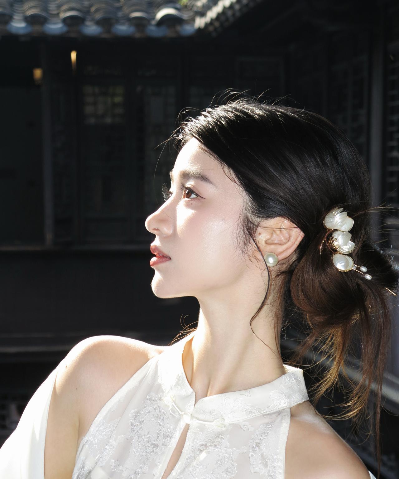 优雅古风少女,白衣飘飘,发间珍珠点缀,古典韵味十足。