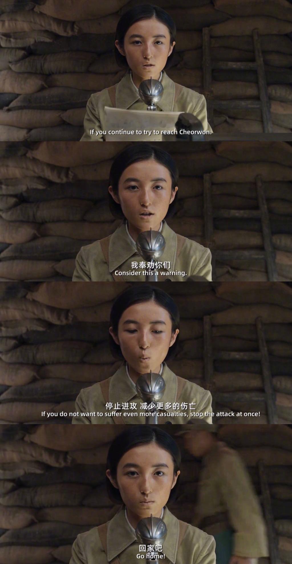 去年《志愿军:存亡之战》里,她在战场上用一声“Go Home”震慑敌军,是展露锋芒的铿锵;今年《志愿军:浴血和平》,她在谈判桌前面对美方无理要求,一句斩钉截铁的“No”,是掷地有声的底气!