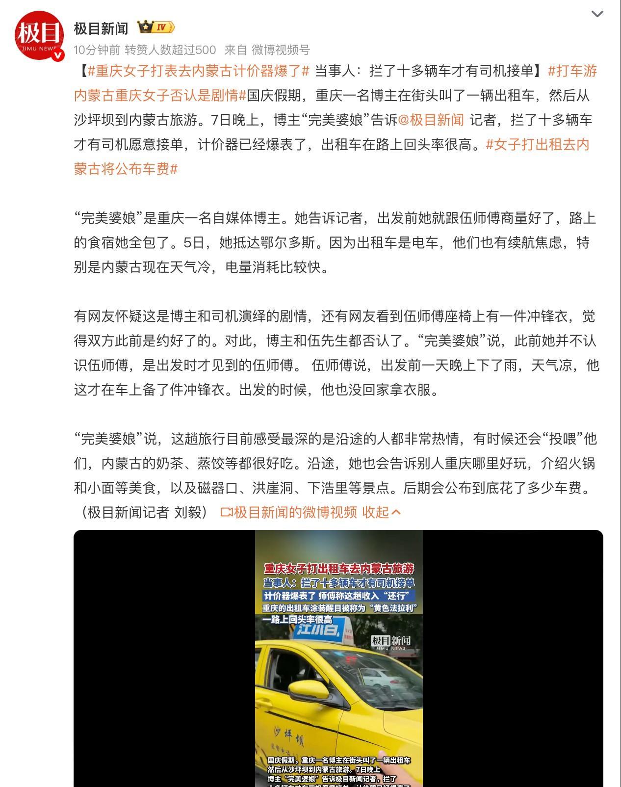 完美婆娘国庆从重庆打车去内蒙这事儿,先不说是不是剧本摆拍,单就说网红完美婆娘和司机师傅都挺疯的。首先,从重庆打车去内蒙玩儿一圈来回估计4000公里了,加上电费和计价器费用估计都小一万了。再加上两人的吃住行,这就又是几大千了。这可比正常飞机、自驾或者租车出游贵太多,能不计成本这么玩儿多少有点疯和行为艺术的味道。其二,如果你是出租车司机,忽然有位美女给你说打车去几千公里(含返程和中途游玩),你敢接招不?需要多方面求证不?需要回家拿点儿换洗衣服不?说走就走只能说司机师傅也很疯,二者疯到一块儿了!至于是不是剧本摆拍,这个相信会有水落石出的一天,咱们攒不下结论。毕竟很多人为了流量是会有点儿疯,但同时大千世界无奇不有。 #万能生活指南#