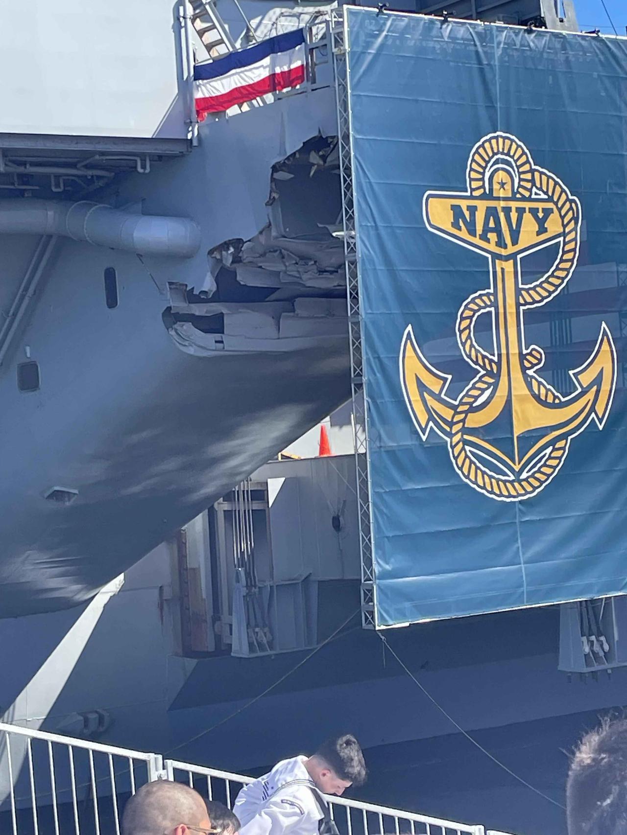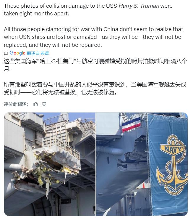 八个月后,杜鲁门号航母多了一块布,用于遮挡“伤口”! 今年2月中旬,“杜鲁门”号航母在地中海水域埃及塞得港附近与一艘大型商船相撞后受损,被迫前往一处美海军基地维修。 而“杜鲁门”号在本次部署期间可谓事故不断,除了撞船,还接连损失了三架F/A-18舰载机,包括被自己的巡洋舰误击、起飞和降落时坠海等。 我猜好面子的特朗普,可能根本不知道那块布后面的“伤口”还在。