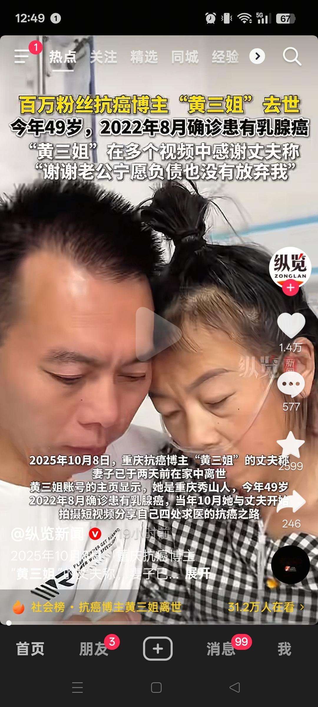 百万的粉丝……抗癌博主“黄三姐”永远地离开了我们。去世时年仅49岁。她被确诊患有乳腺癌,短短三年时间,他们发布了800多个视频,也因此收获了近百万粉丝的关注。 在过往的视频中,黄三姐曾满怀感恩地提及丈夫,感谢他一直以来不离不弃的陪伴。即便在治疗过程中背上了债务,丈夫也从未有过放弃她的念头。然而,命运残酷,今年7月,癌症再次复发,癌细胞在全身肆意转移,她所承受的疼痛如影随形,从未停歇。10月6日,黄三姐陷入昏迷,生命即将步入倒计时,随后她回到家中,在那里走完了人生的最后一程。她丈夫悲痛地表示,黄三姐在临终之际,最放心不下的便是家中两个尚未长大、还未成家的儿子。 黄三姐的坚强与乐观如同一束温暖的光,照亮了无数人的心灵。她的故事,也让我们深深意识到癌症家庭所经历的重重艰辛与不易。黄三姐,一路走好,我们衷心祝愿在另一个世界里,再也没有病痛的折磨。女博主患癌