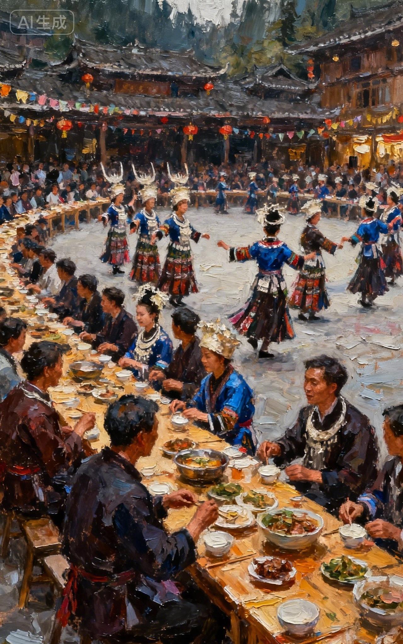 《大餐》 长桌宴罢鼓歌飞, 银饰流光彩袖挥。 苗寨风情人共醉, 满堂笑语尽余辉。
