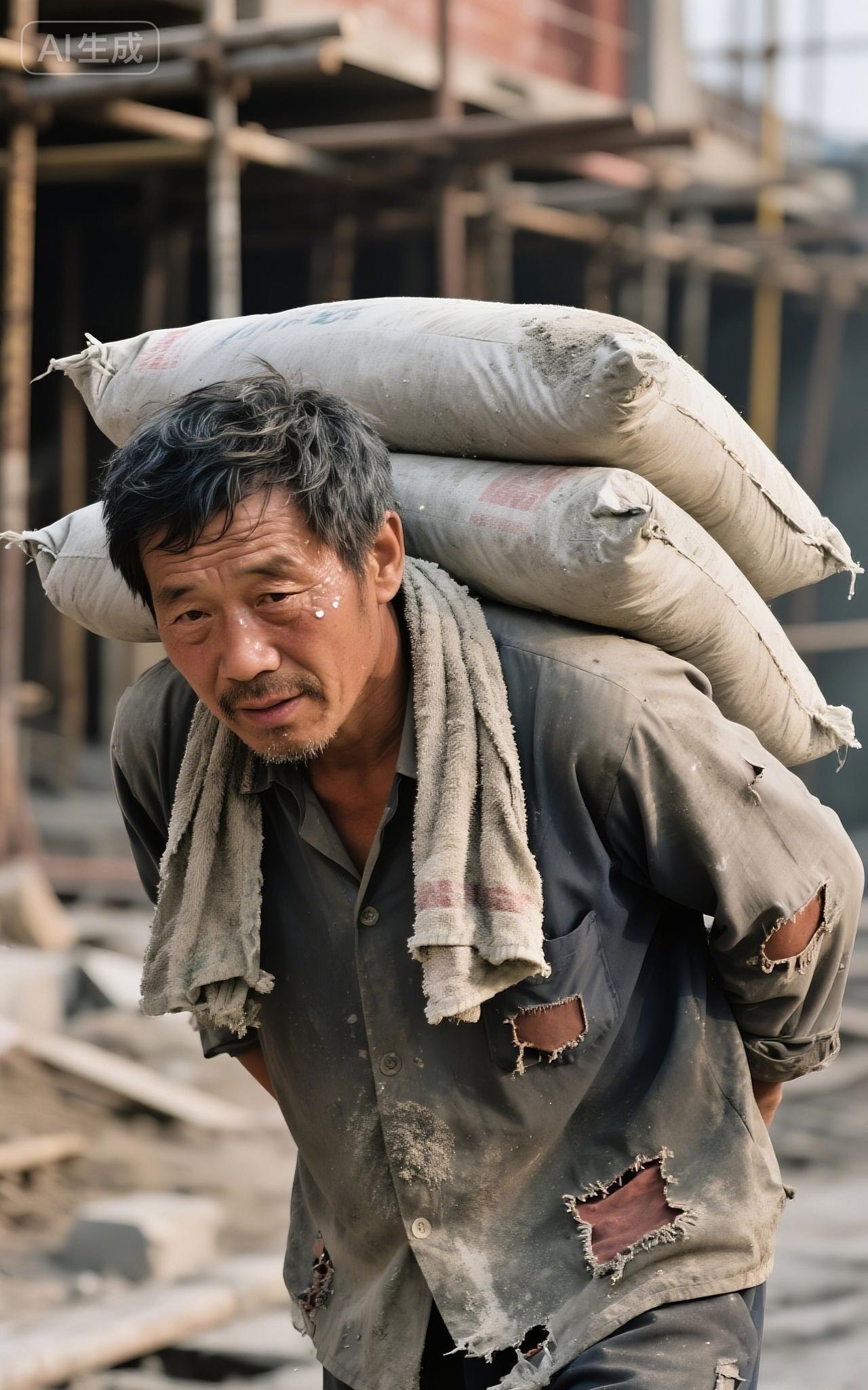 《扛水泥的阿爸》 阿爸肩扛水泥袋, 汗水直流脸上晒。 破衣烂衫尘满身, 为家撑起