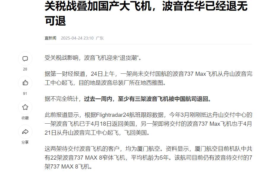 “中国再拒收,就断供!”波音 CEO 凯利・奥特博拉的一句威胁,本想给中国市场施压,没成想却成了 “自曝家丑”。这场彻头彻尾的 “威胁闹剧” ,算是真正暴露了,波音的外强中干,也撕开了全球航空格局改写的序幕。 4月24日,两架喷涂着厦门航空标志的,波音737 MAX客机,在浙江舟山工厂短暂停留后,掉头飞回西雅图。且据不完全统计,此前过去的一周内,至少有三架波音飞机,被中国航司退回。 这场横跨8000公里的“折返跑”,直接让波音CEO凯利·奥特博拉的那句“中国再拒收,就断供”的威胁,变成了一记响亮的耳光。事实上,波音的困境,得从特朗普政府挑起的贸易战说起。 2025年,美国对中国飞机零件加征145%关税,中国反制措施直接导致,波音飞机进口成本飙升125%。这意味着,航空公司采购一架波音737 MAX,需多支付数千万美元,无异于“花冤枉钱”。厦门航空原计划接收的两架737 MAX,目录价格为1.216亿美元,即便按6、7折的市场价值计算,关税也让每架飞机额外成本增加9000万美元。这种情况下,拒收成了航空公司的无奈选择。 但波音的问题,远不止关税这么简单。2018年和2019年两起737 MAX空难事故,造成346人遇难,暴露出的MCAS系统缺陷让全球停飞该机型长达数年。尽管中国民航局2025年5月发布适航指令确认整改有效,但人们对波音的信任重建异常艰难。 2025年6月,印度航空一架波音787客机又遭遇起飞后失事(初步判定因操作失误),再次引发市场对波音机型的质疑。更糟糕的是,美国推行对等关税政策,致使波音787客机价格飙升4000万美元。我国航司不仅暂停接收该机型,还将3架已运到国内的737 MAX退回,其中包含原计划交付国航的新机。 受多重因素冲击,波音财务状况已临近危险边缘。数据显示,自2019年以来,波音已累计亏损额达321.29亿美元。为维持运营,其甚至变卖仍在盈利的Jeppesen子公司等优质资产以压缩成本。而中国市场,这个曾经的“大金主”,如今却成了波音的噩梦。 2018年波音曾向中国交付超200架飞机,占其全球交付量的25%,但2024年前三季度,波音对华交付量仅291架,同比减少21.56%,同期空客交付量达447架,市场份额差距拉大至11.37%(空客52.73% vs 波音41.36%)。更严峻的是,波音在中国窄体机市场的主导地位已被空客取代,而宽体机市场亦因关税和国产替代面临挤压。 就在波音焦头烂额之际,中国商飞的C919正在悄然崛起。2024年C919交付量达47架,2025年产能规划提升至75架,并计划2030年前后实现年产200架目标。目前C919订单已超1500架,三大航司计划2031年前各运营百架,东南亚市场亦通过租赁方式引入国产机型。 同时,C929宽体客机研发加速,中国国航已签署首家用户协议,进一步冲击波音787、空客A330的市场空间。国产飞机的成本优势(较同型进口机低10%-15%)和本土化服务网络,正重塑中国航空市场的竞争格局。 面对中国市场的流失和国产替代的压力,波音本应放下身段,好好跟中国谈谈。可波音CEO凯利·奥特博拉却选择了最愚蠢的方式——威胁断供。这种“吃饭砸锅”的行为,彻底激怒了中国。中国对波音整机加征125%关税的举措,堪称教科书级操作。 这不仅让航空公司采购成本翻倍,更让波音陷入两难:继续交付则亏损扩大,暂停交付则失去市场份额。数据显示,仅2025年就有50架波音飞机可能因关税问题滞留美国,波音的现金流压力可想而知。 更讽刺的是,波音的威胁,反而成了中国航空产业崛起的最佳广告。当波音在西雅图工厂为滞销的737 MAX发愁时,中国商飞的C919正在上海临港的第二条总装线上有条不紊地生产着。尽管C919目前还面临着发动机供应不稳定等问题,但中国航发集团研发的长江CJ-1000A已经进入适航取证的冲刺阶段,预计2025年完成认证后就能批量装到C919上。按计划,2030年C919的国产化率能从现在的60%左右提升到90%以上,到时候整个供应链才能真正自主可控。 波音的“停供”威胁,恰似一个时代的注脚。当它试图用订单要挟中国时,却忘了:中国早已不是那个任人欺负的国家。在全球产业链深度融合的今天,任何试图搞“脱钩断链”的行为,最终都将搬起石头砸自己的脚。波音的困境,既是美国霸权主义的缩影,也是中国崛起的见证。或许波音该担忧的,不是中国何时恢复接机,而是当C929翱翔蓝天时,自己是否还能保住“航空霸主”的宝座。 参考资料:直新闻
