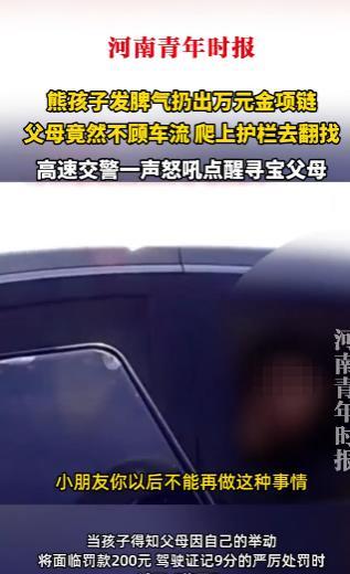 “电视都不敢这么演!”2025年10月,浙江,一熊孩子发脾气将万元金项链扔到高速上,父母竟然不顾高速疾驰的车流,将车停下后爬上护栏寻找,交警发现后一句“钱重要还是命重要”点醒这对父母,网友:这家人也太胡闹了! 一些熊孩子发起脾气来常常会做出过分的行为,由于年纪还小加上愤怒时的冲动情绪,他们根本不会去考虑后果,哪怕会让父母身处险境。 一家人开车行驶在高速上,行驶的过程中父母与孩子拌了几句嘴,没想到熊孩子一气之下竟然将家长的万元金项链从车窗丢了出去。 父母见状急忙将车停下,两人不顾疾驰的车流,直接横穿高速爬上护栏翻找起来,这一危险的行为被高速交警发现,急忙上前制止。 在了解了事情的经过后,交警质问这对父母钱重要还是命重要,他们小声地回答命重要,并且承认自己确实是太着急了,毕竟金项链太值钱了。 最终这对父母被处200元罚款,驾驶证记9分,孩子看到父母受到严厉处罚,这才意识到自己的行为是不对的,交警趁机教育他下次不能再做这种事了。 不少网友直呼这家人胡闹,家长跟孩子应该好好交流,这么大的孩子三观还没有完全建立,做事不考虑后果,俗话说人教人教不会,事教人一遍就会,希望这次的事情能让这家人得到教训,不要再做危险的行为! 信息来源:《熊孩子发脾气扔出金项链,父母竟在高速上不顾车流,爬上护栏去找》浙江日报