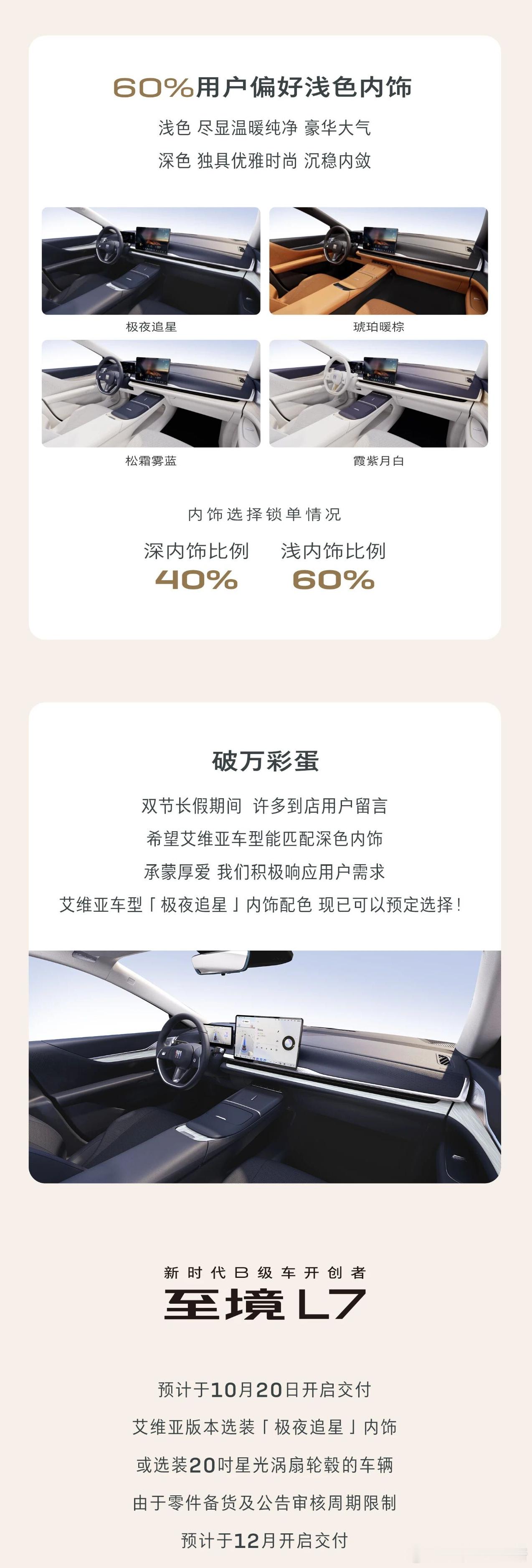 新车将在 10 月 20 日开启交付,另外艾维亚版将新增「极夜追星」深内饰。