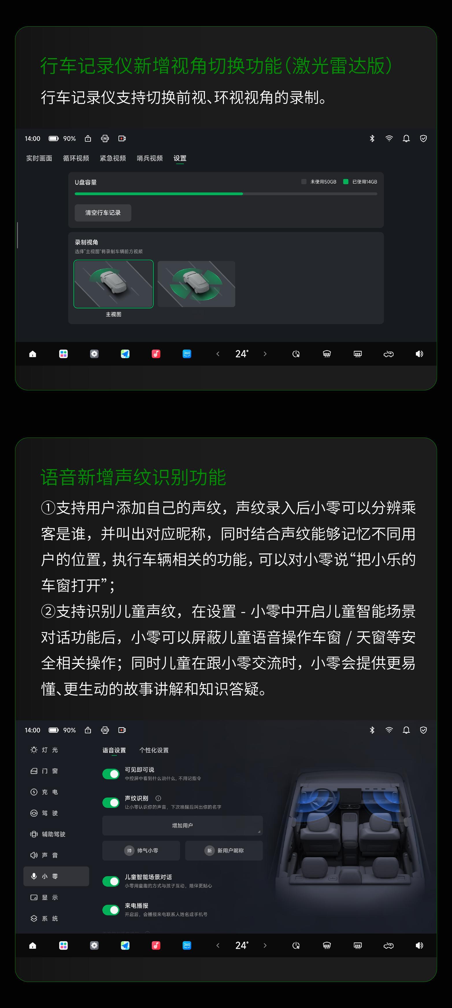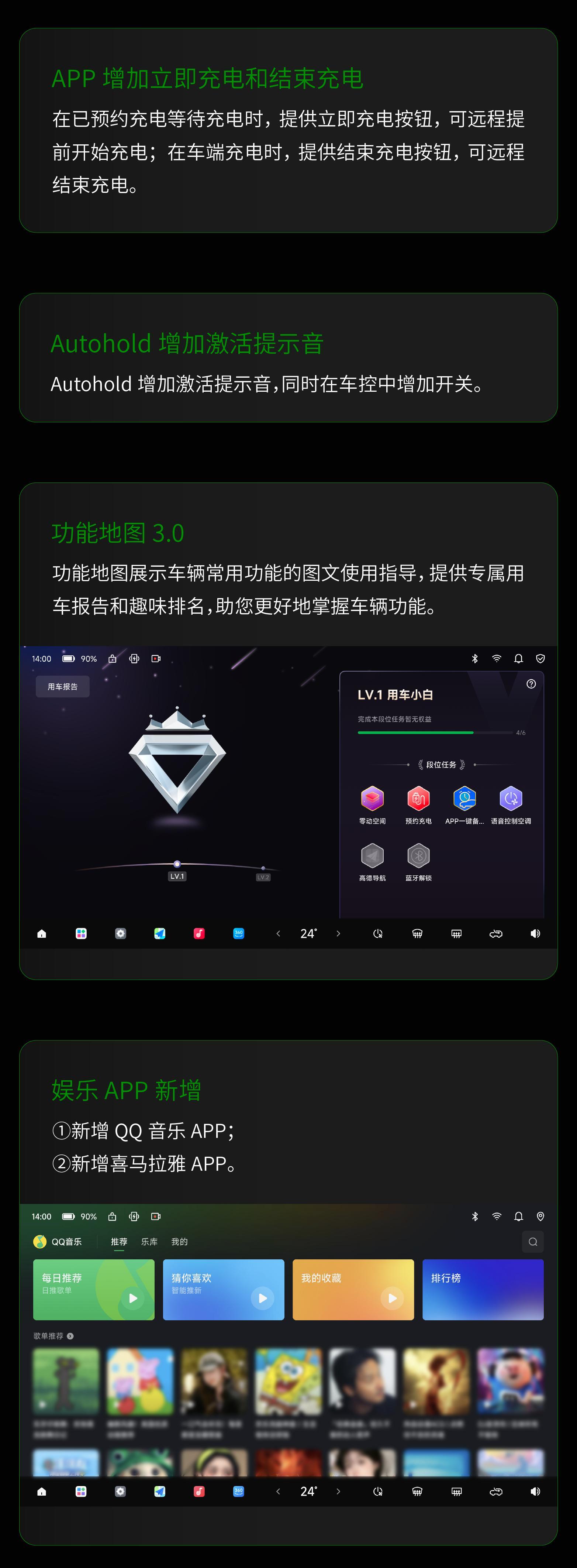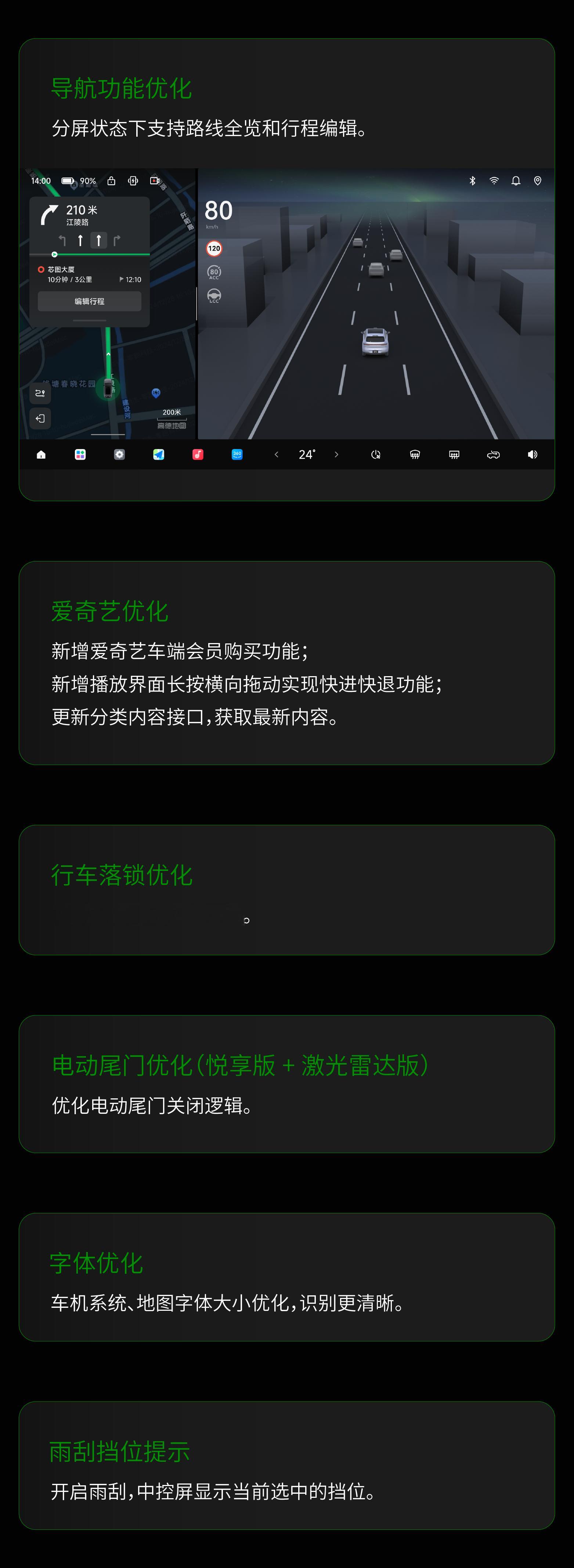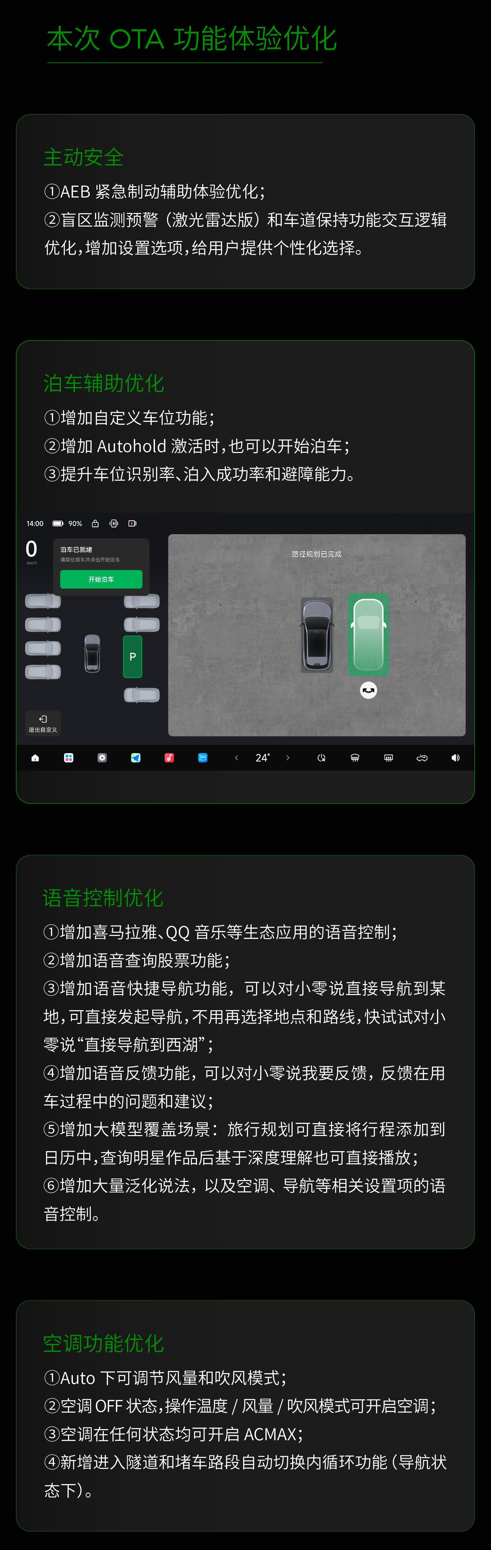 10月OTA新增超多实用功能,激光雷达版解锁通勤领航辅助、路沿检测,舒享/悦享版get哨兵模式、转向辅助影像;语音声纹识别能叫昵称、防儿童误操作,还能语音查股票、快捷导航;APP可远程控充电,车机新增QQ音乐、喜马拉雅,更有保养提醒、摩斯密码车钥匙等贴心设计~