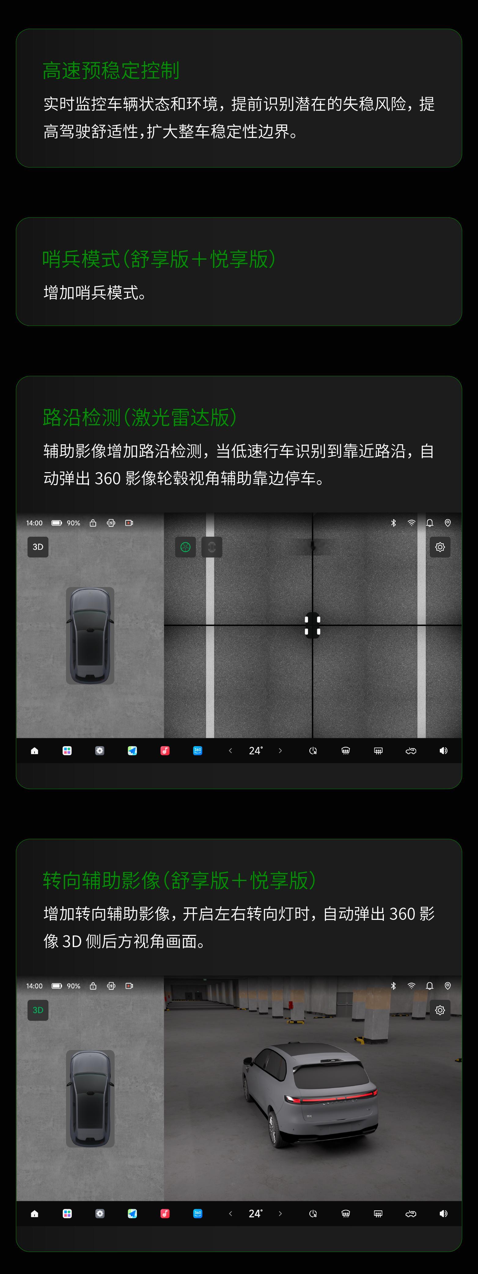 ✅辅助驾驶类:新增通勤领航辅助(学习路线后实现开放道路点到点辅助驾驶)、路沿检测(低速靠近路沿自动弹出360影像轮毂视角),优化盲区监测预警交互逻辑。