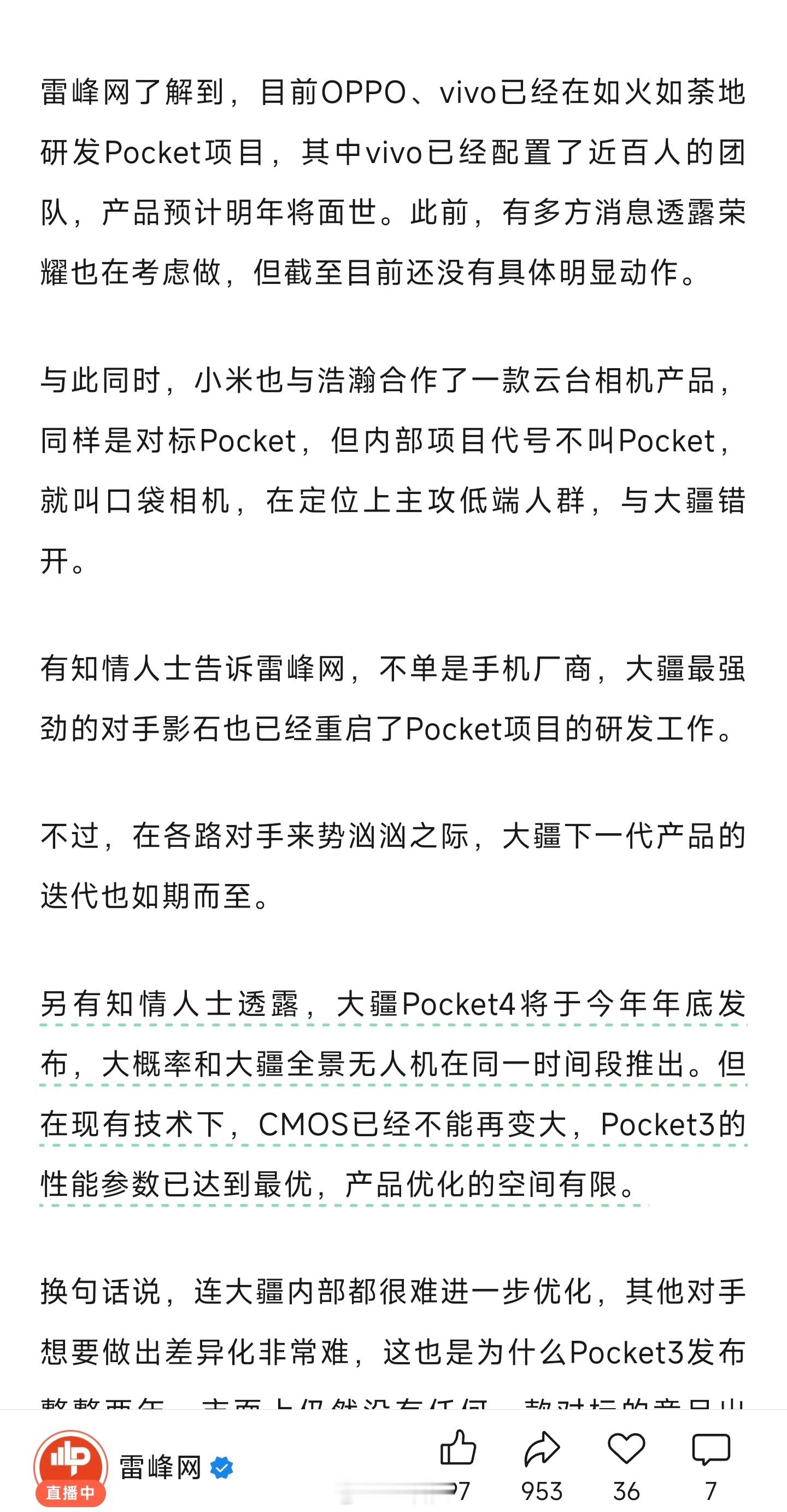 大疆在无人机市场确实有护城河,很难被打败,但像Pocket 3这样的产品,手机厂商也确实能造出来,屏幕和镜头供应链都有天然优势。