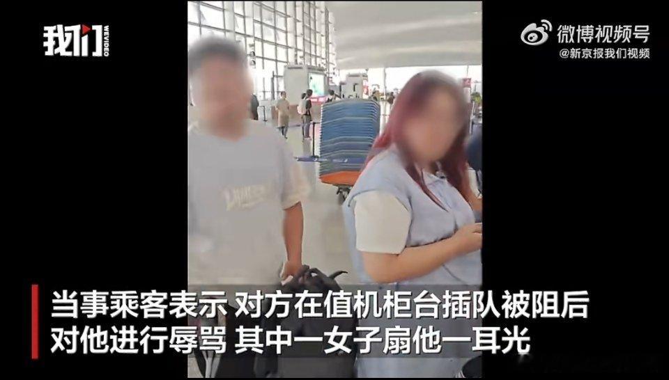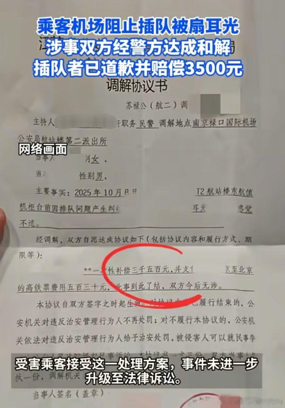 🔻网传一名男乘客在南京机场阻止插队被扇耳光。涉事双方已和解,插队者向男生道歉+赔偿男生3500元。乘客在机场阻止插队被扇耳光