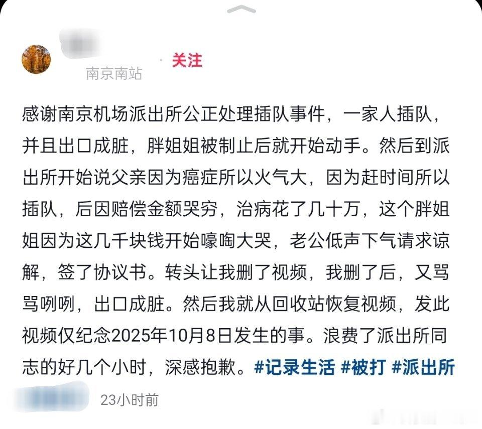 🔻网传一名男乘客在南京机场阻止插队被扇耳光。涉事双方已和解,插队者向男生道歉+