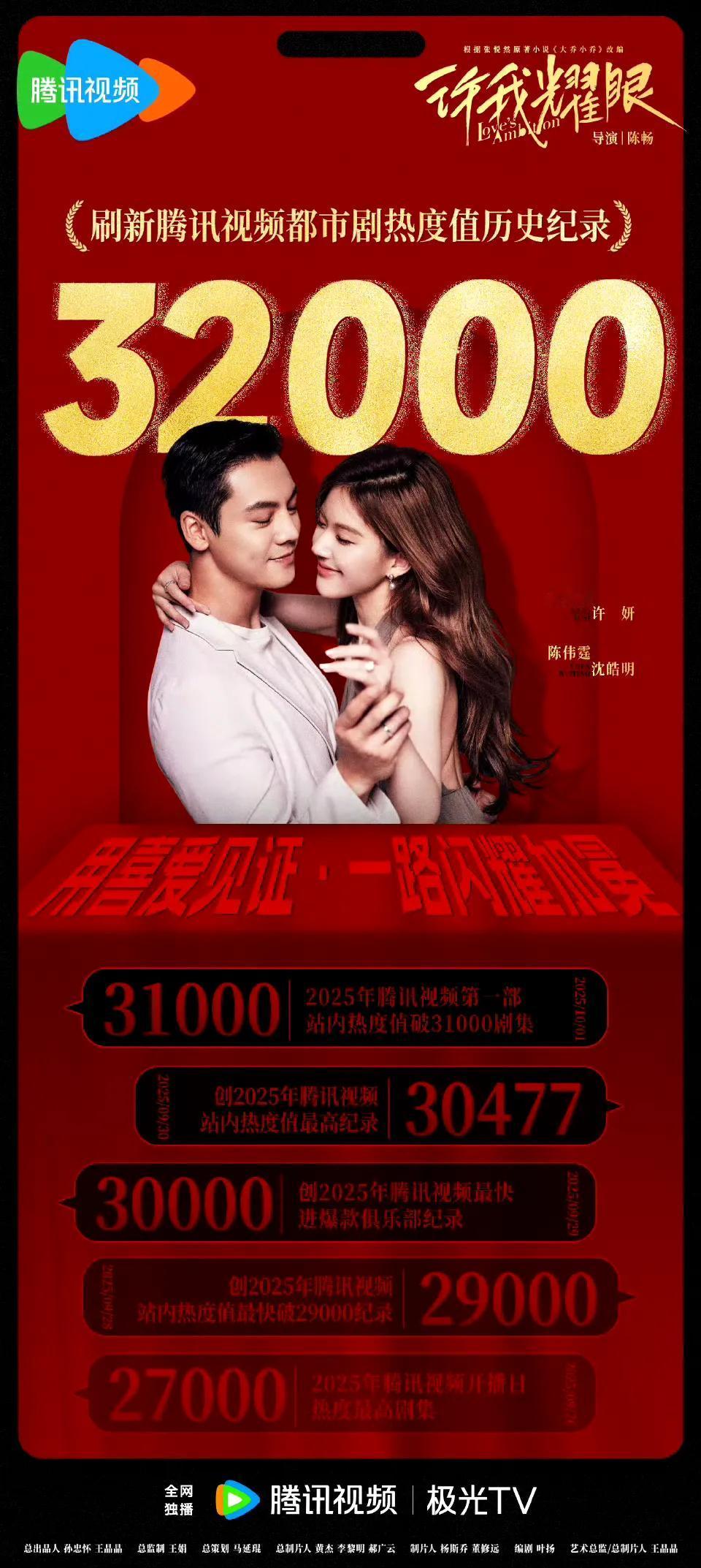 《许我耀眼》到处提32000热度这事,乍一看是有点得瑟。但这剧成绩是真猛啊! 创2025腾讯最快进入爆款俱乐部剧集 开播没预热没宣传,赵露思还注销官方账号,谁都觉得要凉,结果直接热度第一,全网2.7万实时热度,四天就突破32000,刷新腾讯都市剧纪录,国外也火爆。 这剧导演会拍,剧情有倒叙插叙,画面切换流畅。男女主年龄差大,视觉冲击明显。赵露思造型多变,人设新颖。 而且它制作成本高,单集800万,温峥嵘演技炸裂。这么多亮点,提提32000热度好像也情有可原。 许我耀眼海报 许你耀眼 许我耀眼热播 许你耀眼短剧 许你耀眼杀青 许我闪耀 许我耀眼名场面