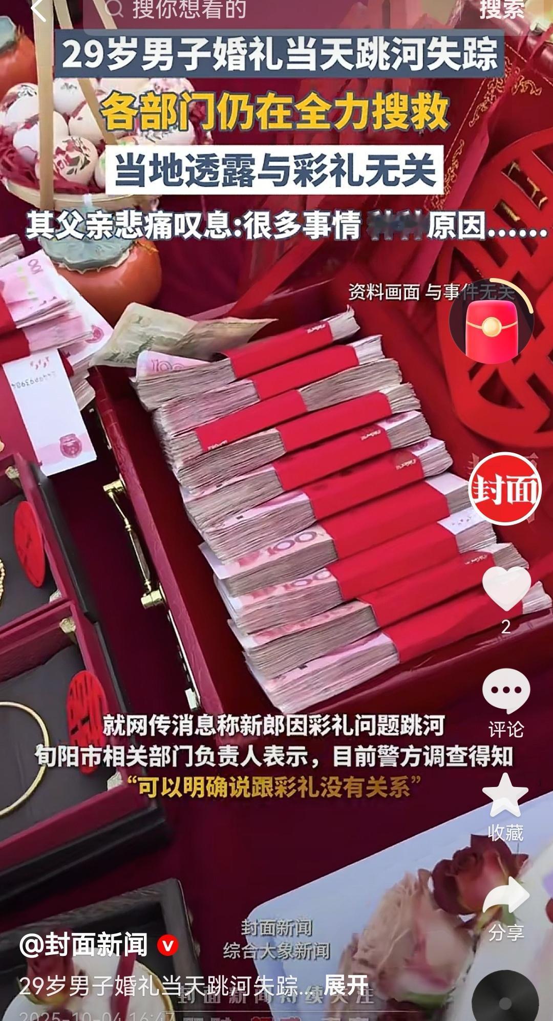陕西29岁男子婚礼跳河后续, 这样网传信息不实,请勿再传! 目前该男子仍未找到! 网传该男子是因为彩礼临时加价而想不开,特别是新娘下车临时要20000元下车礼,导致男子情绪崩溃,最终酿成悲剧。这些已被他的家人证实是不实消息,该新郎轻生是因为结婚前后太多的家庭琐事,让他一时想不开,才在婚礼时做出傻事。 到现在还没有明确到底是什么成了压垮他的最后一片雪花,估计也只有他自己知道了。 现在人们的工作压力、生活压力都很大,各种焦虑也是层出不穷,很多人也因此患上了抑郁症等病症,在没有出事前,大家看着和正常人没什么两样,直到悲剧发生了,才后悔莫及! 所以平时我们一定要学会自我调整,更是要多关心一下身边的人,有可能你的一句问候,就能挽救一个生命,甚至是一个家庭。 我们自己更是要想开点,你是一个连生死都看淡的人,又何惧活着,只有活下去才能有希望,才能不让自己的悲伤带给自己的亲人朋友。 希望这名男子能够平安无事,快点回到家人的身边,想开了,真没有过不去的坎!