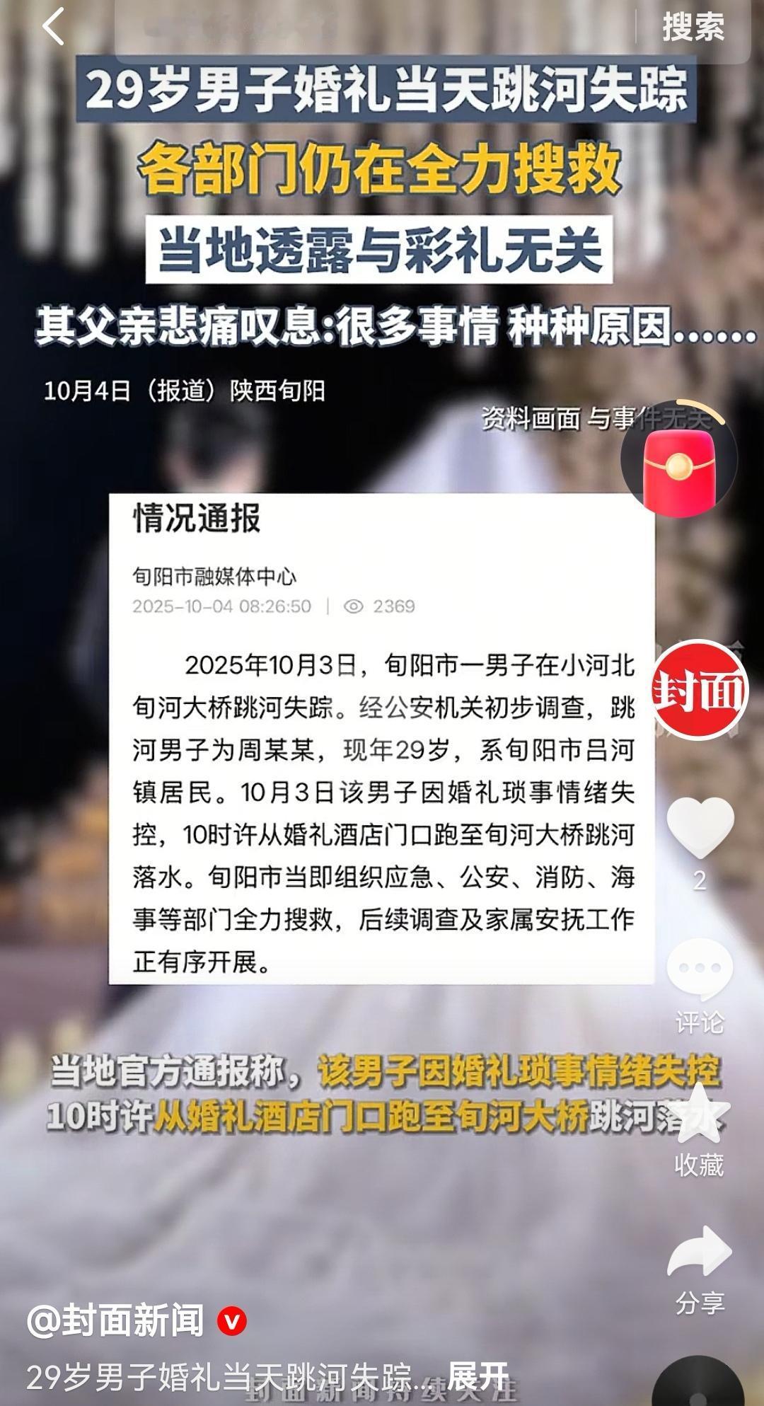 陕西29岁男子婚礼跳河后续, 这样网传信息不实,请勿再传! 目前该男子仍未找到!