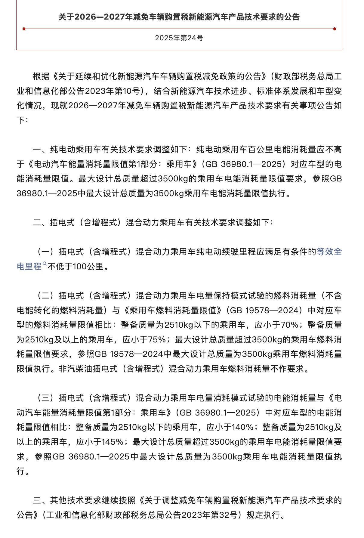 新标准明确了 3500kg 以上乘用车的限值要求,为大型豪华电动车、高端插电混动车型提供了政策依据,参照 3500kg 限值执行的规定,可能使部分重型车型更容易满足减免购置税条件,燃料消耗量要求的放宽,降低了大型插电混动车型的准入门槛