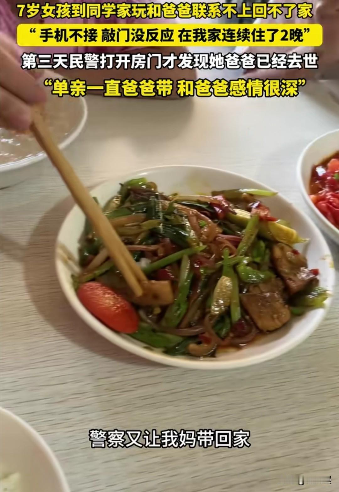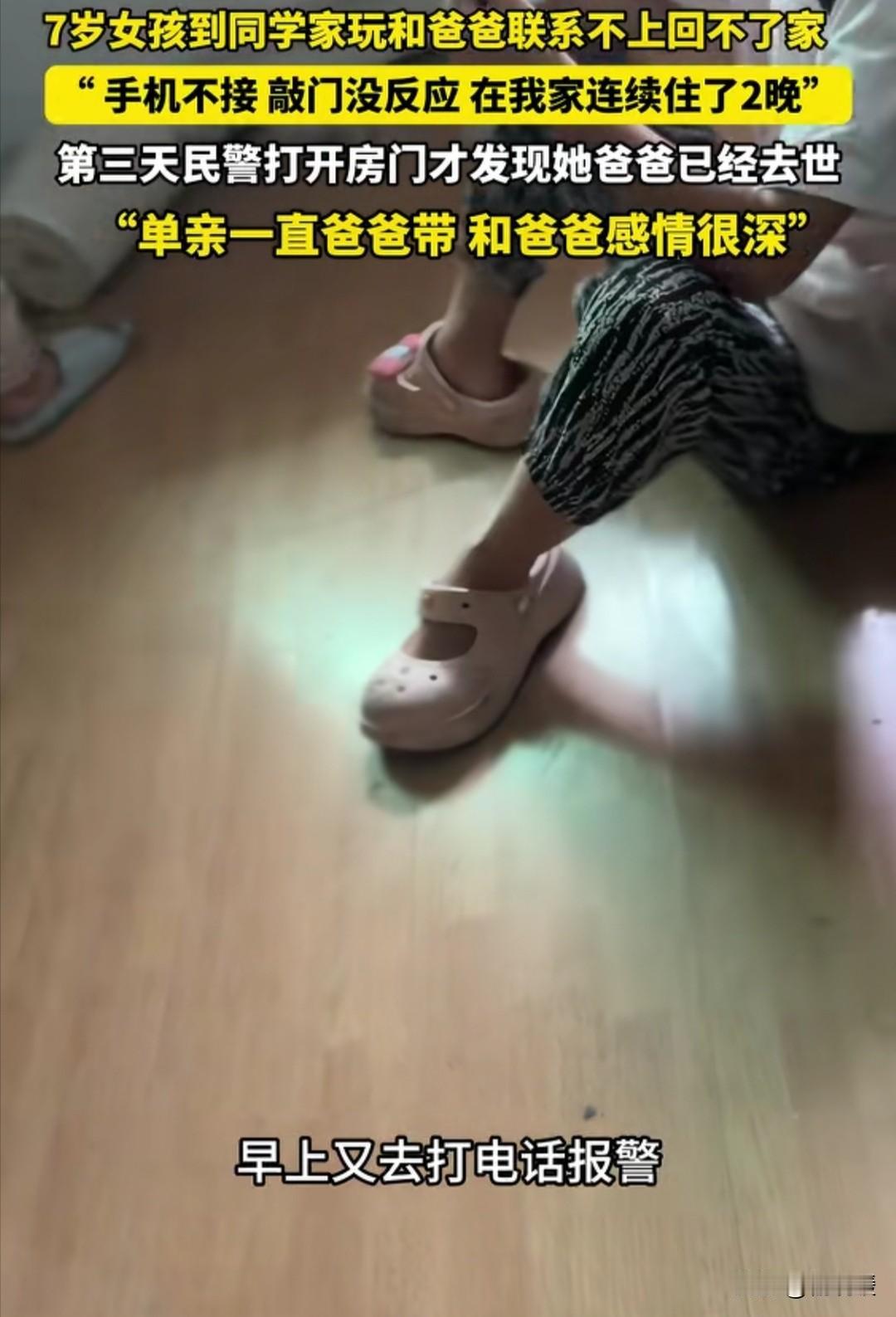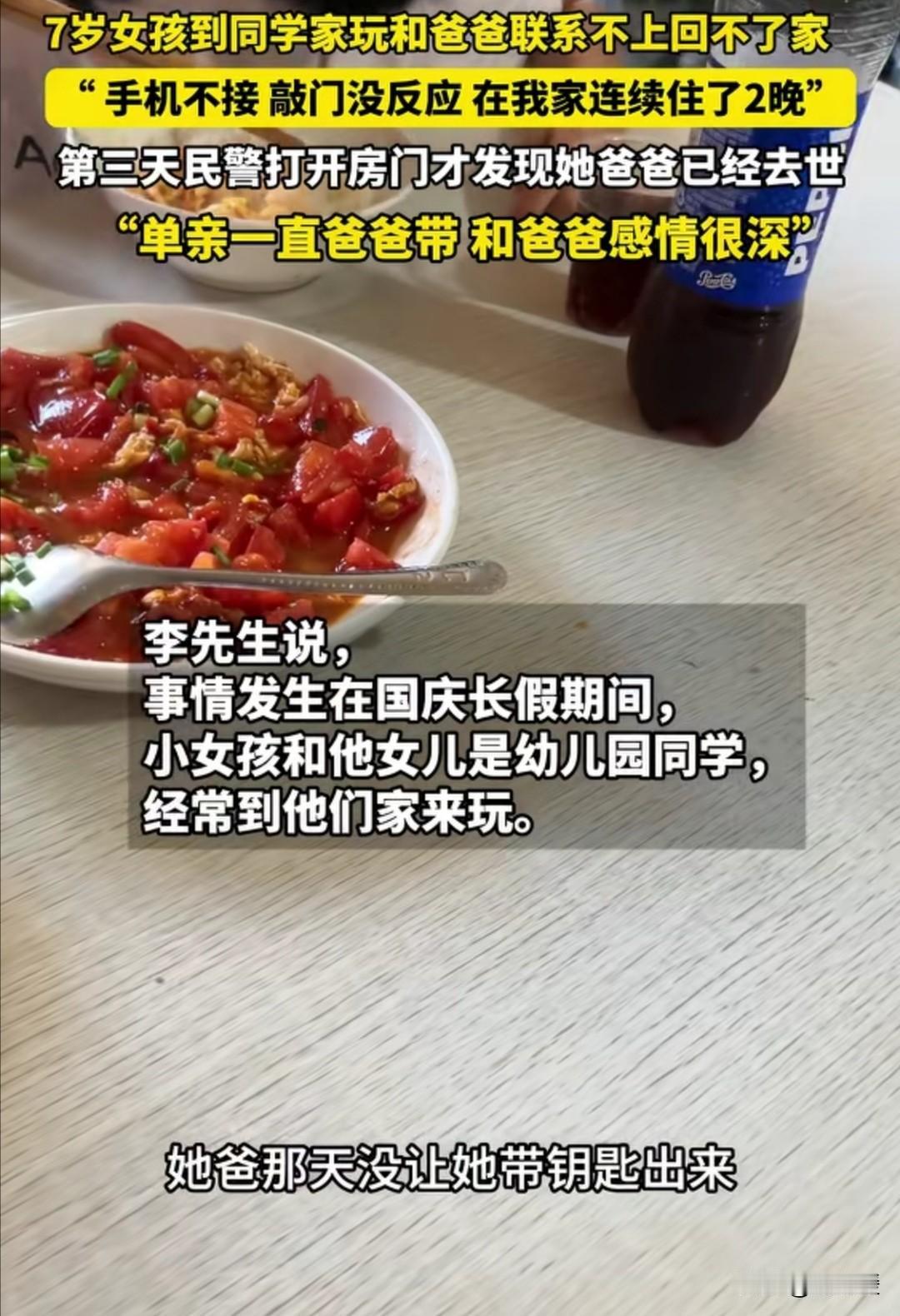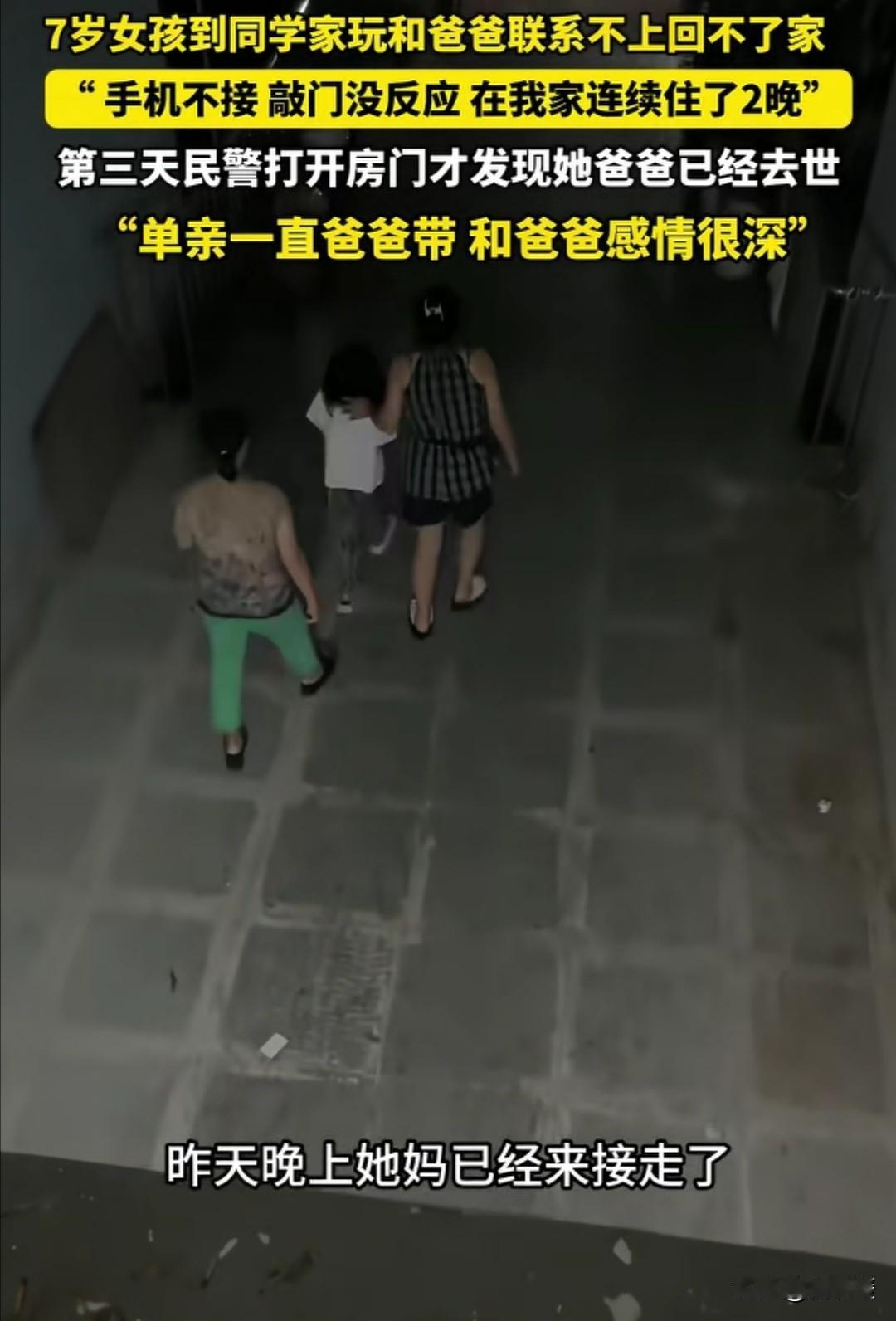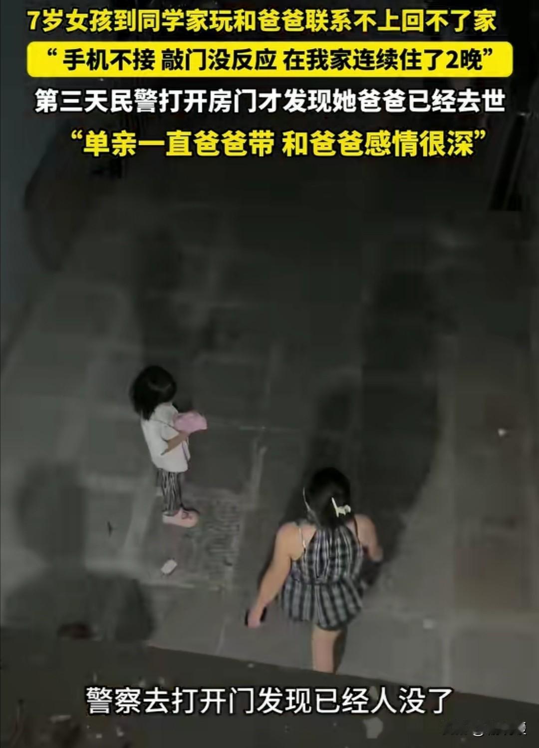 “小女孩或许一辈子都不能释怀了吧!”重庆,国庆假期期间,7岁的小女孩和往常一样,又去同学家里玩了,玩到天快黑时,她便往家走,那天恰好没有带钥匙,她只能敲门让爸爸开了。 可敲了很久,她爸爸都没来给她开门,于是,她又返回了同学家,同学奶奶帮忙给她爸爸打电话,结果没人接。 心里感觉到不对劲,同学奶奶便报了警,警察跟着他们一起来到小女孩家门外,又是敲门,又是打电话,小女孩的爸爸依旧没现身。 警察猜测可能是去哪里干活了吧!便让同学奶奶把小女孩带回自己家中睡。 到了第三天早上,同学奶奶还是觉得不对劲,又报了警,这次警察直接破门而入,发现小女孩的爸爸已经去世了。 没多久,小女孩的妈妈赶回来把她接走了。 小女孩的爸爸今年50多岁了,自从和她妈妈离婚后,一直独自抚养着她,两个人感情很深。 通过这个事,也给所有有结婚生子打算的人提了个醒,早点结婚生孩子,不要等到年龄特别大了,才要孩子。
