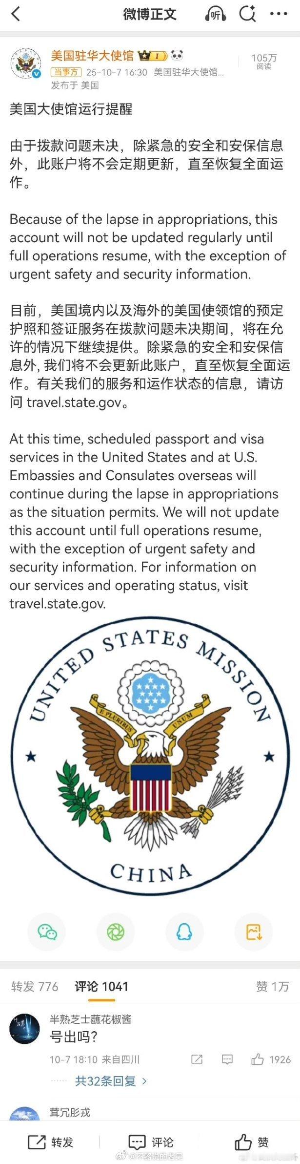 美驻华大使馆宣布微博微信停更 事实证明,美国人罢工起来真的是可以彻底休息,理由竟然是没有拨款~哈哈