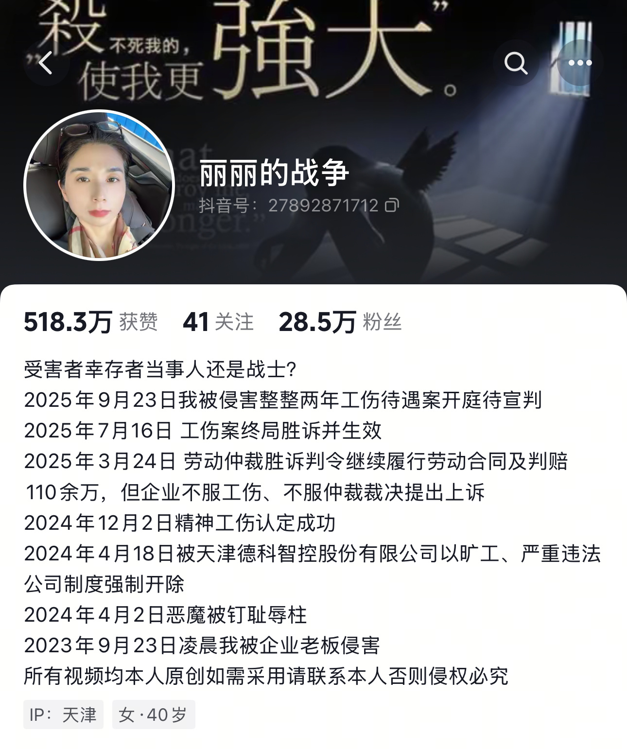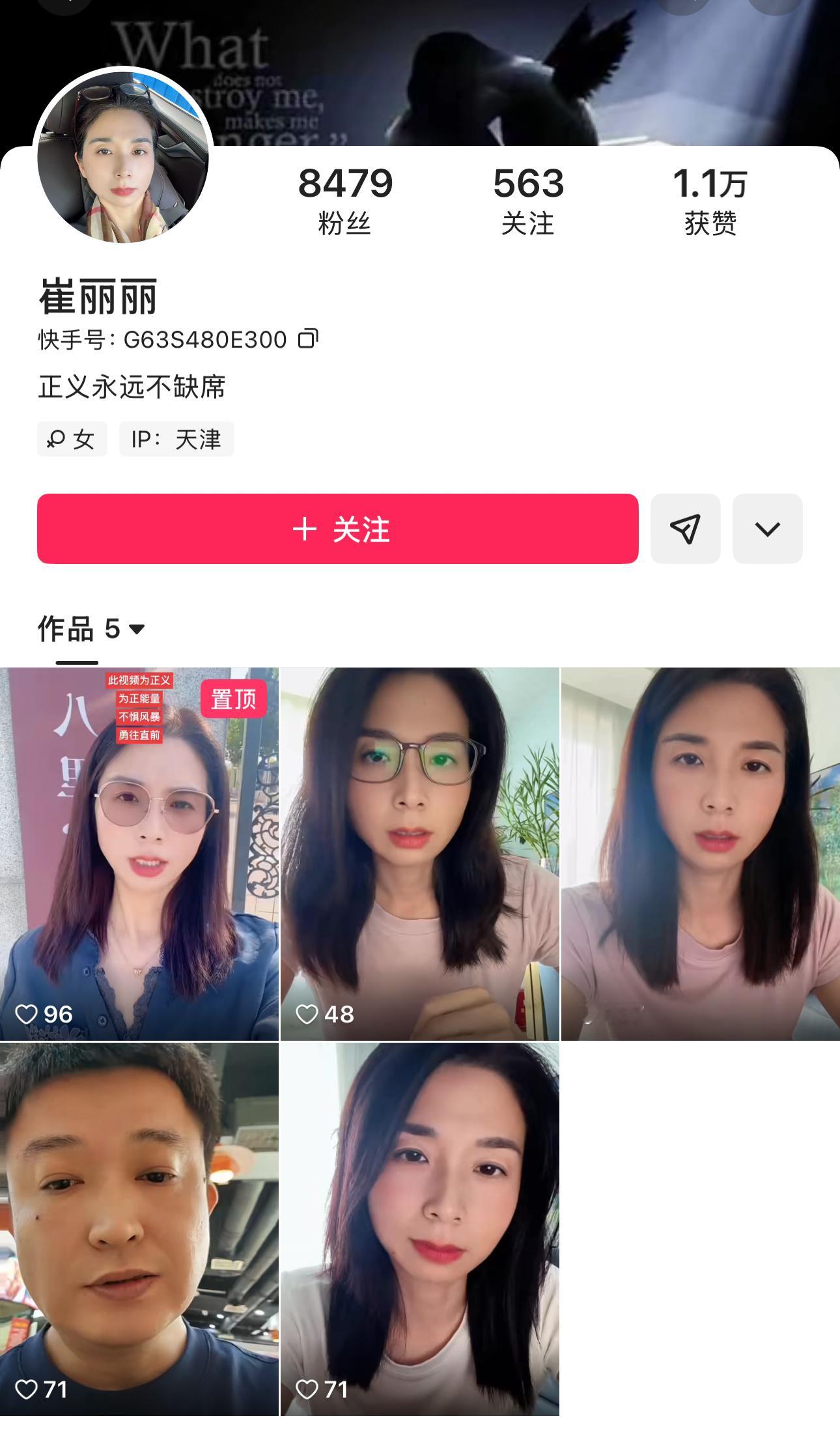 只有快手,没有“丽丽的战争”账号,只有一个崔丽丽账号,没有认证,无法核实是否本人。但IP同样是天津,如果是搬运账号账号的话应该会被投诉,合理推断是本人,但因为平台数据不高被崔丽丽放弃了