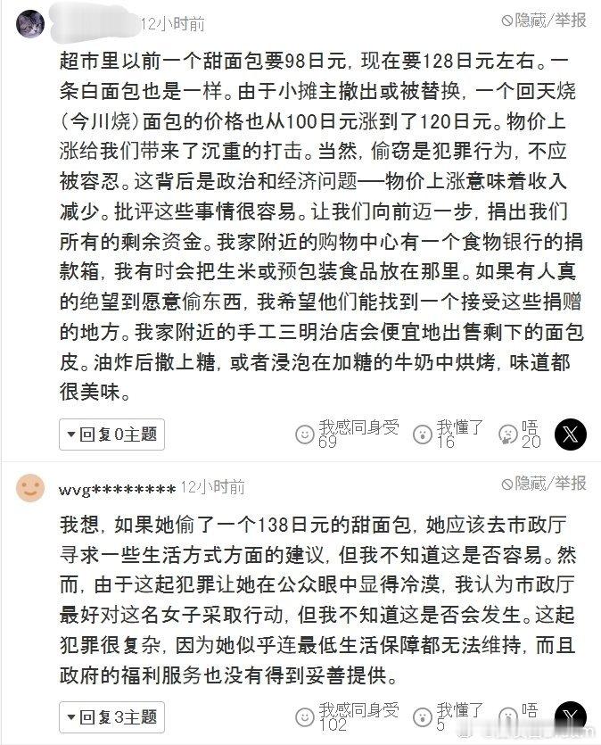 有日本网民表示,以前日本超市里一个甜面包只要98日元,现在要128日元左右,太贵了。