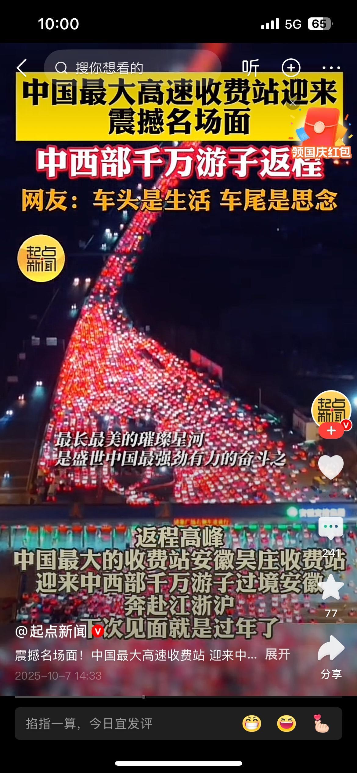 2025年国庆中秋假期返程高峰时,在安徽吴庄收费站出现的壮观车流。这座被誉为“中国最大”的收费站,在假期尾声迎来了真正的压力测试。 安徽省滁州市全椒县,皖苏两省交界处G40沪陕高速与G42沪蓉高速共用枢纽,双向36条车道(12进24出)国庆返程峰值。10月7日出口流量超13万辆次,高峰时每小时超6000辆次。 吴庄收费站的“震撼”场面,是其特殊地理位置和节假日出行规律共同作用的结果。 它地处连接中西部与长三角经济圈的咽喉要道,承担着巨大的“潮汐式”车流——节前大量车辆由东向西涌入中西部,节后则集中由西向东返回长三角。 由于往东进入南京方向的部分路段在节假日免费,吴庄收费站成为免费的终点和收费的起点,所有车辆到此都必须减速通过,形成天然的“节流阀”。 虽然收费站设计日通行能力约为6万辆次,但在2025年10月7日的返程高峰,其出口流量峰值一度突破每小时8000辆次,远超设计负荷,拥堵几乎难以避免。 尽量避开假期最后一天(如10月7日)的下午至傍晚的极端高峰,选择清晨或夜间出发可能更顺畅。 最后提醒各位车主朋友们:提前准备,备好食物、饮水和应急物品,以应对可能的长时间拥堵。