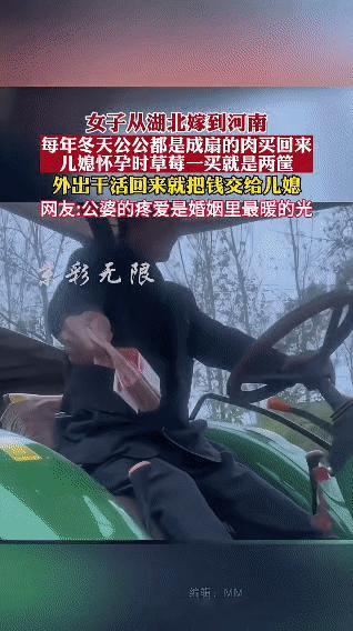 湖北女子远嫁河南,在婆家却被宠成了宝。每年冬天,公公都会买成扇的肉回来,就盼着给她补身体。她怀孕时,公公更是大方,草莓一买就是两筐,毫不吝啬。公公外出干活,回来后也总第一时间把钱交给她,对她的信任和疼爱溢于言表。网友们看了都羡慕不已,纷纷表示:“这婆家真的嫁对了,公婆的疼爱就是婚姻里最温暖的光!”远嫁女人心得 远嫁女子 公婆