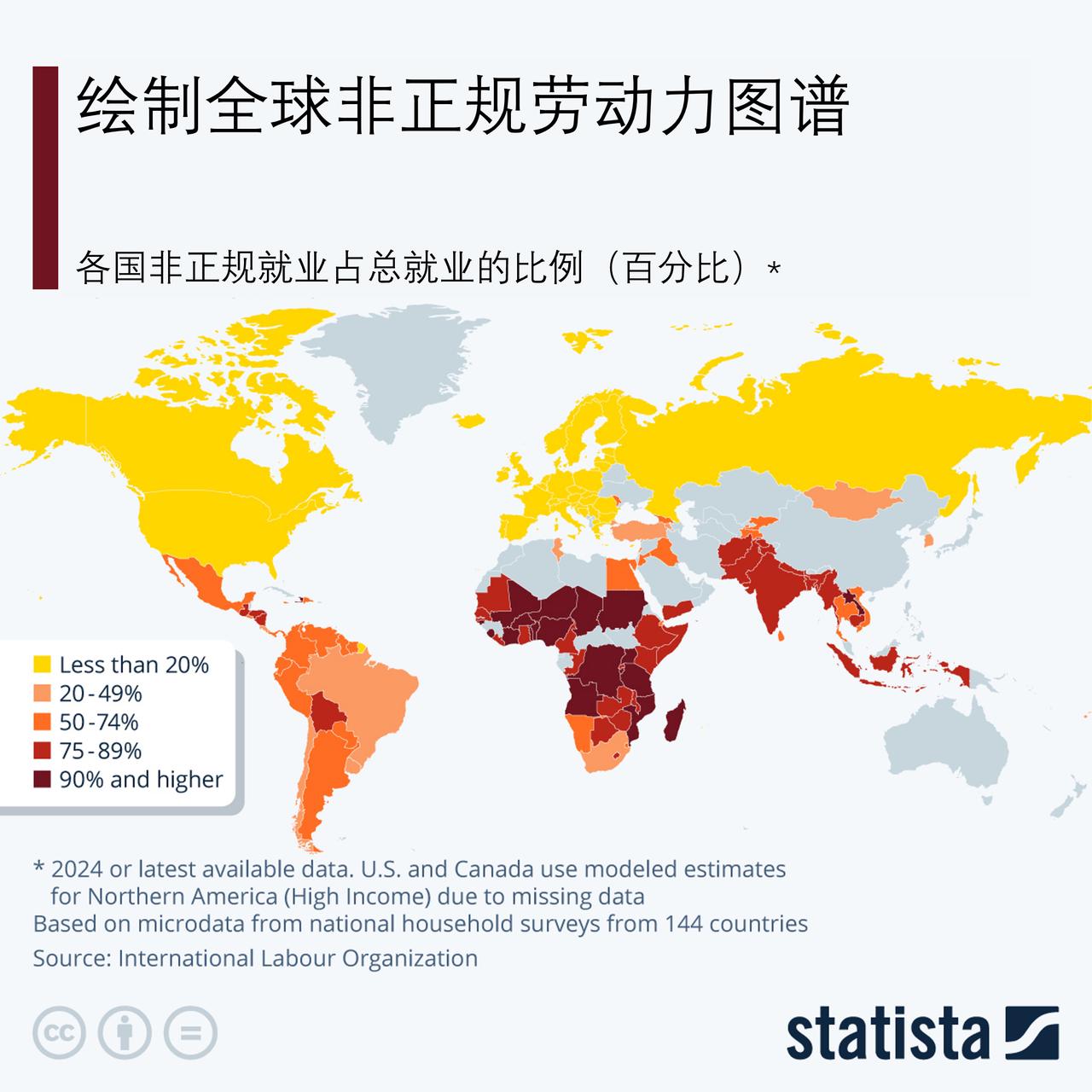 全球非正规就业群体规模有多大?来看全球非正规劳动力分布 据国际劳工组织(ILO)的模型估算,全球约有六成的劳动者从事非正规经济活动。多年来,许多国家的非正规经济状况不仅持续存在,甚至还有所加剧,其背后的原因包括正规部门就业岗位的有限增加以及不平等现象等多重因素。如今,全球有一半的劳动力未得到社会保障安排的有效覆盖,也未享受到工作场所安全措施的法律保障。 虽然非正规经济在生产、就业创造和收入增长方面对许多人而言发挥着重要作用,但该行业的劳动者却无法享受到国家劳动法规和社会保障带来的诸多好处。新冠疫情暴露了这类劳动者的脆弱性。 如下图所示,这种模式在地理分布上也很清晰,非正规就业在“全球南方”地区最为普遍,该地区的几个西非和中非国家的非正规就业比例超过 90%。南亚和东南亚的几个国家也有较高的非正规就业比例,其中印度尼西亚、缅甸、印度和孟加拉国的这一比例在 75%至 89%之间。 虽然这张地图上的大部分数据是基于全国家庭调查得出的,但由于缺少相关调查数据,美国和加拿大则采用北美洲(高收入)的模型估算数据来代表这两个国家,其平均比例为 8%,这与波兰(8.6%)和英国(6.5%)最为接近。 根据国际劳工组织 2023 年发布的《非正规经济中的男女就业状况》报告,全球范围内,非正规就业对男性的就业贡献率(60%)高于对女性的贡献率(55%),这在一定程度上是由于中国和俄罗斯等大国的影响所致,在这些国家,男性“更易处于非正规就业状态”。然而,在 56%的国家中,尤其是在低收入和中低收入国家,从事非正规行业工作的女性所占比例更高。此外,生活在农村地区的人们从事非正规就业的可能性要远远高于生活在城市中心的人们。