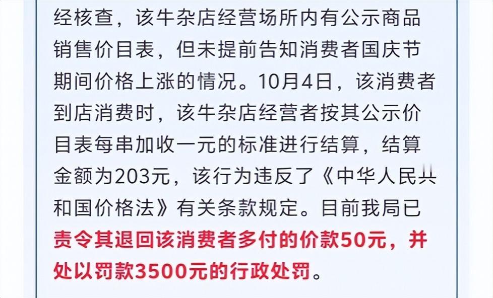 黑笔划过价目表的声音,比牛杂汤的膻味还让人膈应。10 月 4 日连州 “串串香花园牛杂” 店,凌女士捏着 203 元账单的手越攥越紧 —— 进店时价目表明明白白,结账时每串都多收 1 块,质疑声刚起,老板就带着四五个人围上来催:“国庆都涨价,别磨蹭!” 她被逼着付了钱,转头想拍证据,却见店员正拿黑笔在价目表上补写 “国庆加价”,字迹歪歪扭扭,还甩着笔喊 “你打 12315 啊”。这哪是调价,是把消费者当砧板上的肉,宰完再补刀。 可评论区竟有人扯 “节日人工贵”“几块钱至于吗”。没人反对合理涨价,提前贴张告示,愿吃就吃,是双向选择。但这家店干的是 “低价勾人进门,结账再宰刀” 的勾当,早踩了《价格法》的红线 —— 市监局 9 月才发过告诫书,它倒好,2023 年就因违规上了经营异常名单,如今更嚣张。 最后罚 3500 元、退 50 元,罚的不是涨价,是那份 “你奈我何” 的黑心。连州牛杂香了几十年,不该被一支黑笔搅臭 —— 毕竟谁也不愿吃碗牛杂,还咽下一肚子 “被当冤大头” 的气。