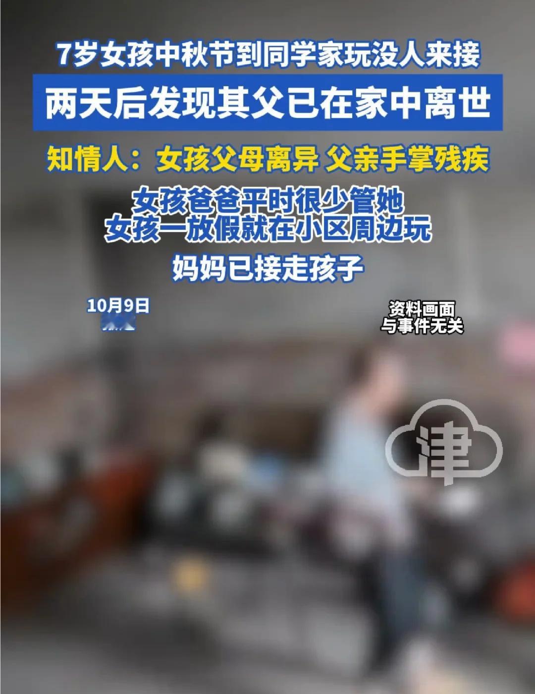女孩中秋节到同学家玩没人来接 父亲离世 7岁女孩中秋节到同学家玩没人来接两天后发现其父已在家中离世知情人:女孩父母离异 父亲手掌残疾女孩爸爸平时很少管她 女孩一放假就在小区周边玩妈妈已接走孩子(津云)父母离异 父亲去世