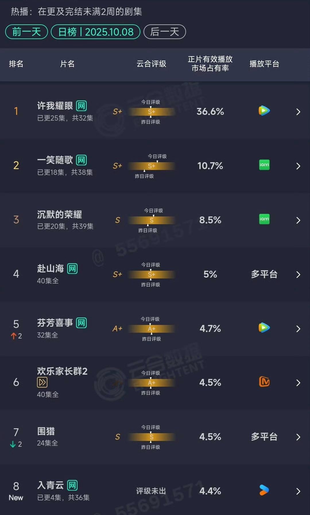 8号的云合数据许我耀眼:36.6%一笑随歌:10.7%沉默的荣耀:8.5%入