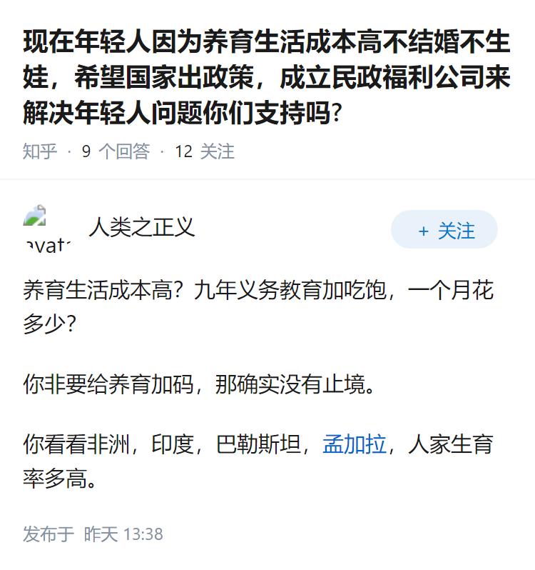 现在年轻人因为养育生活成本高不结婚不生娃,希望国家出政策,成立民政福利公司来解决