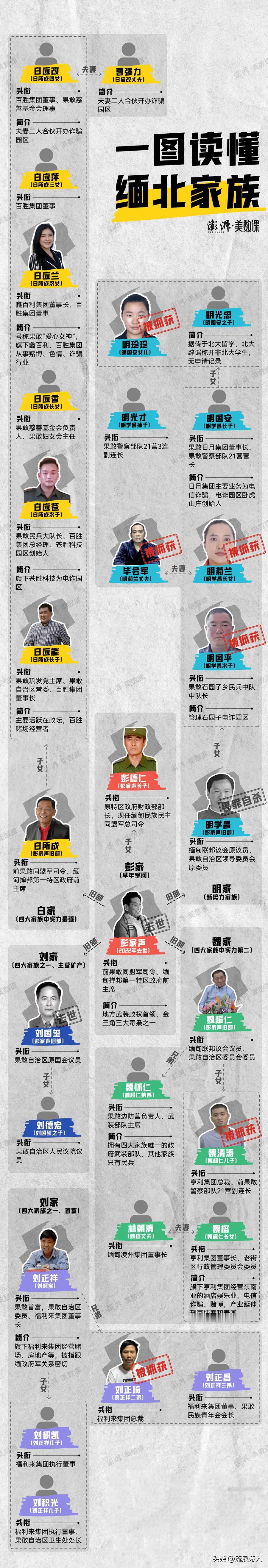 明家犯罪集团,在缅北不算厉害 真正厉害的是缅北4大家族 ①白所成家族→四大家族中势力排行第一 白所成没怎么读过书,18岁左右应征入伍,一开始追随薛家声,一路晋升至同盟军副司令兼政法部长、禁毒总指挥等要职。 2009年,发动兵变,背叛彭家声,掌控可果敢民兵大队,出任果敢自治区第一届领导委员会主席。 2015年起,开始做起了赌场、诈骗等违法生意,声势浩大。直至2024年才被捕。其家族成员大多都参与其中。 ②魏超仁家族→四大家族排名第二 同样,魏超仁也是彭家声的一员大将,与白所成一起背叛彭家声,后掌控着果敢边防部队,手上有不少重武器。 跟白家一样,做着赌博、诈骗等生意。甚至把这种不法生意做到了泰国、柬埔寨等地方。 ③刘国玺家族→白所成的副手 跟白所成和魏超仁一起背叛彭家声,以毒品、矿山、人口贩卖、奴隶黑窑为主业,电诈涉及相对较少。 ④刘正祥家族→四大家族中,唯一与白家没有关系的家族。 缅北最早从事诈骗行业的人,他掌控的福利来集团是果敢最大电诈园区。同时也从事毒品生意。 除以上四大家族外,其次才是明家,明家属于四大家族外的新兴势力。 随着我国与更多国家深化务实合作,进一步加大联合打击力度、全面清剿境外窝点,必将给予这些顽固分子以迎头痛击,将电信网络诈骗犯罪“毒瘤”彻底清除,更好保护人民群众生命财产安全。 (信息来源:百度百科) 普法行动