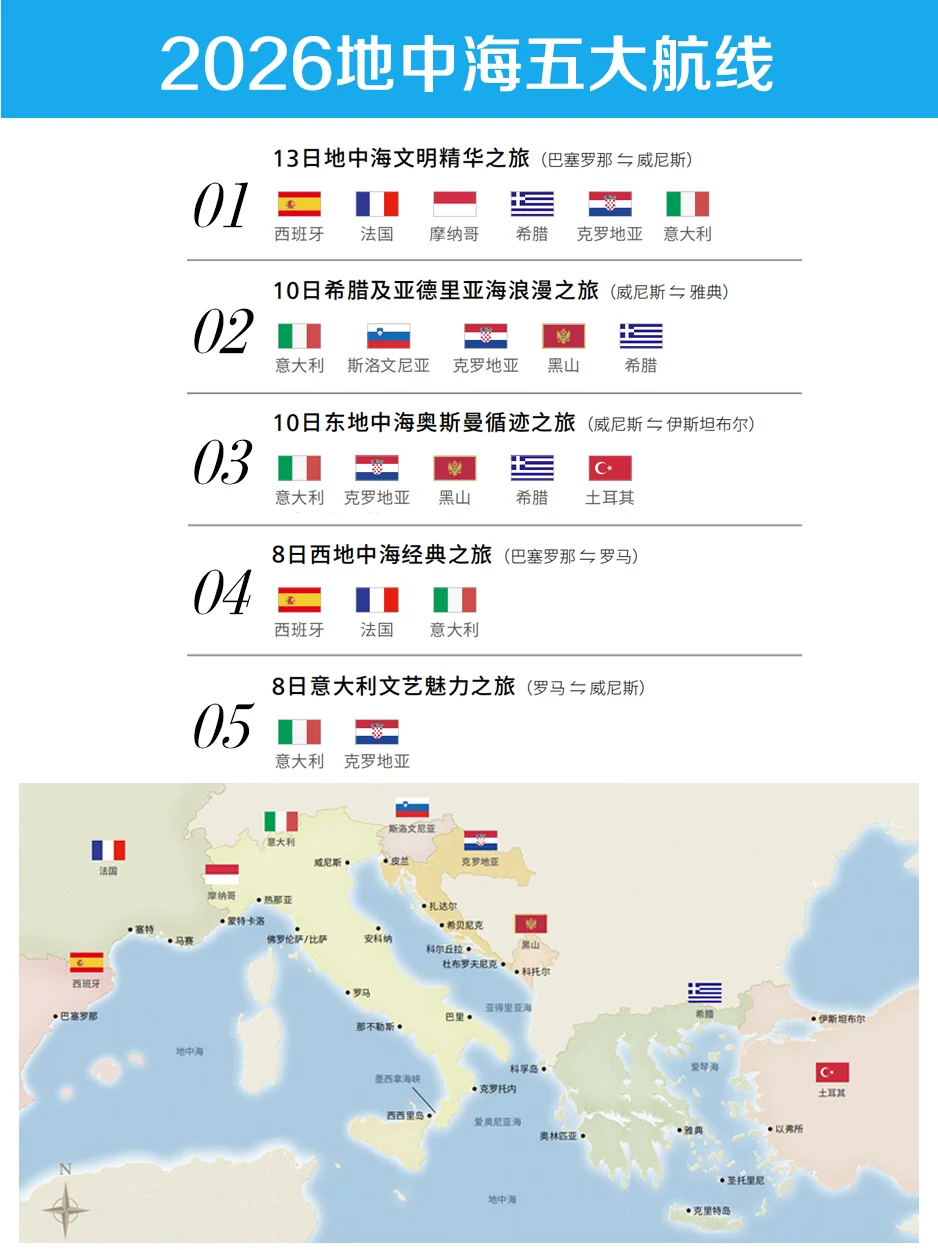 ✅13 日地中海文明精华之旅 途经:西班牙→法国→摩纳哥→意大利→克罗地亚→希腊 出发港:巴塞罗那 / 威尼斯 必打卡:罗马古迹、比萨斜塔、杜布罗夫尼克古城、科孚岛海景、圣马可广场