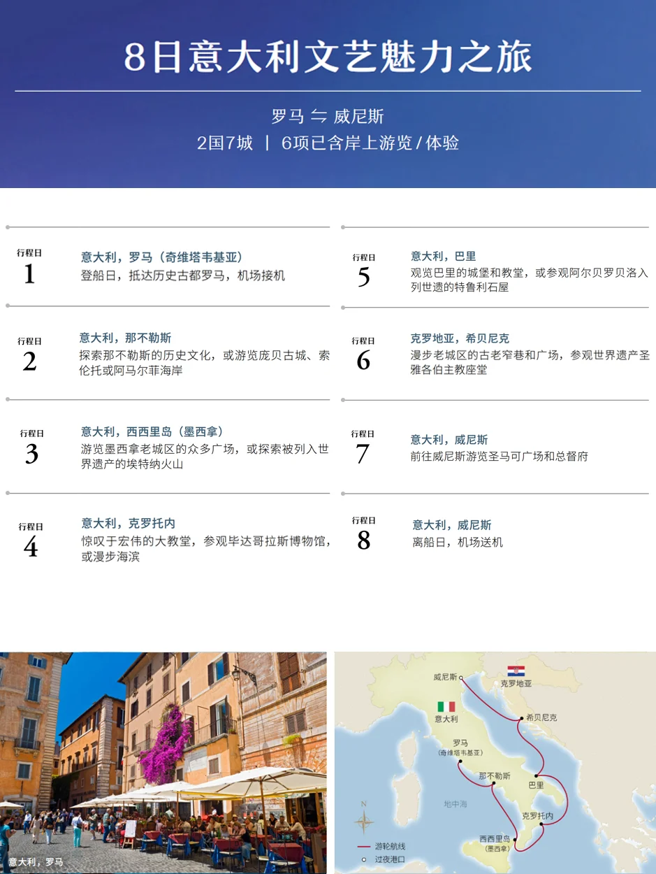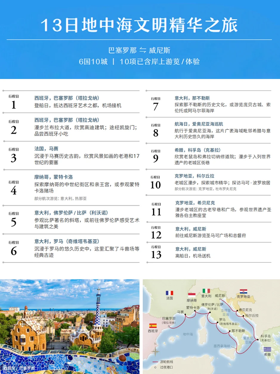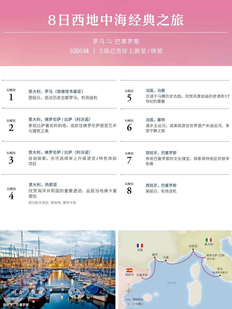 ✅8 日西地中海经典之旅 往返:巴塞罗那⇋罗马 途经:马赛、热那亚、佛罗伦萨、塞特等 优势:8 天短行程,性价比高,不用请假太久