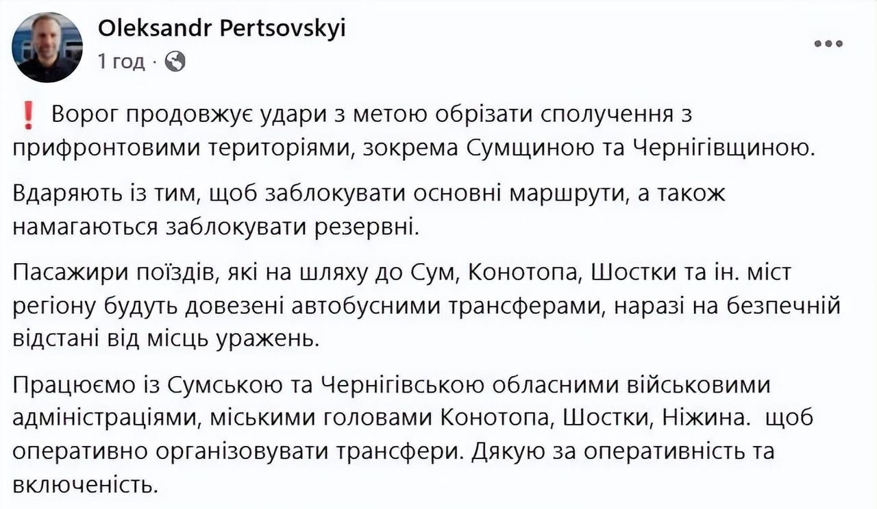 此前有乌克兰媒体报道称俄军袭击乌克兰平民列车,乌克兰铁路公司否认了今天一列平民客运列车在切尔尼戈夫州遭到俄军袭击的传言,据悉这个谣言最初是苏梅州科诺托普市市长造的。已知今天切尔尼戈夫州确实有火车遇袭,只不过并不是平民客运列车,那么情况基本上是明确的。 此外,根据乌克兰铁路公司的说法,目前苏梅州与切尔尼戈夫州之间的铁路交通已经因为俄军的袭击而中断。