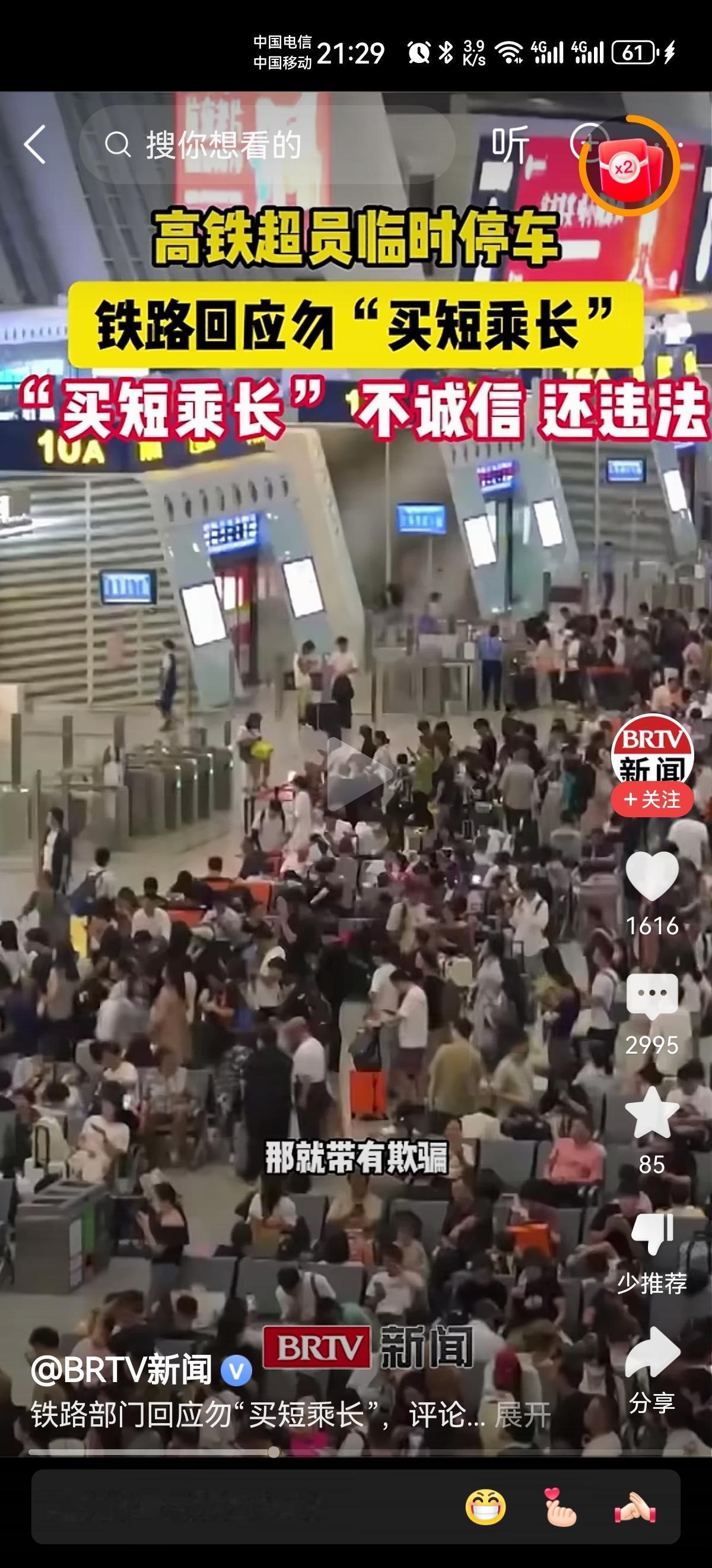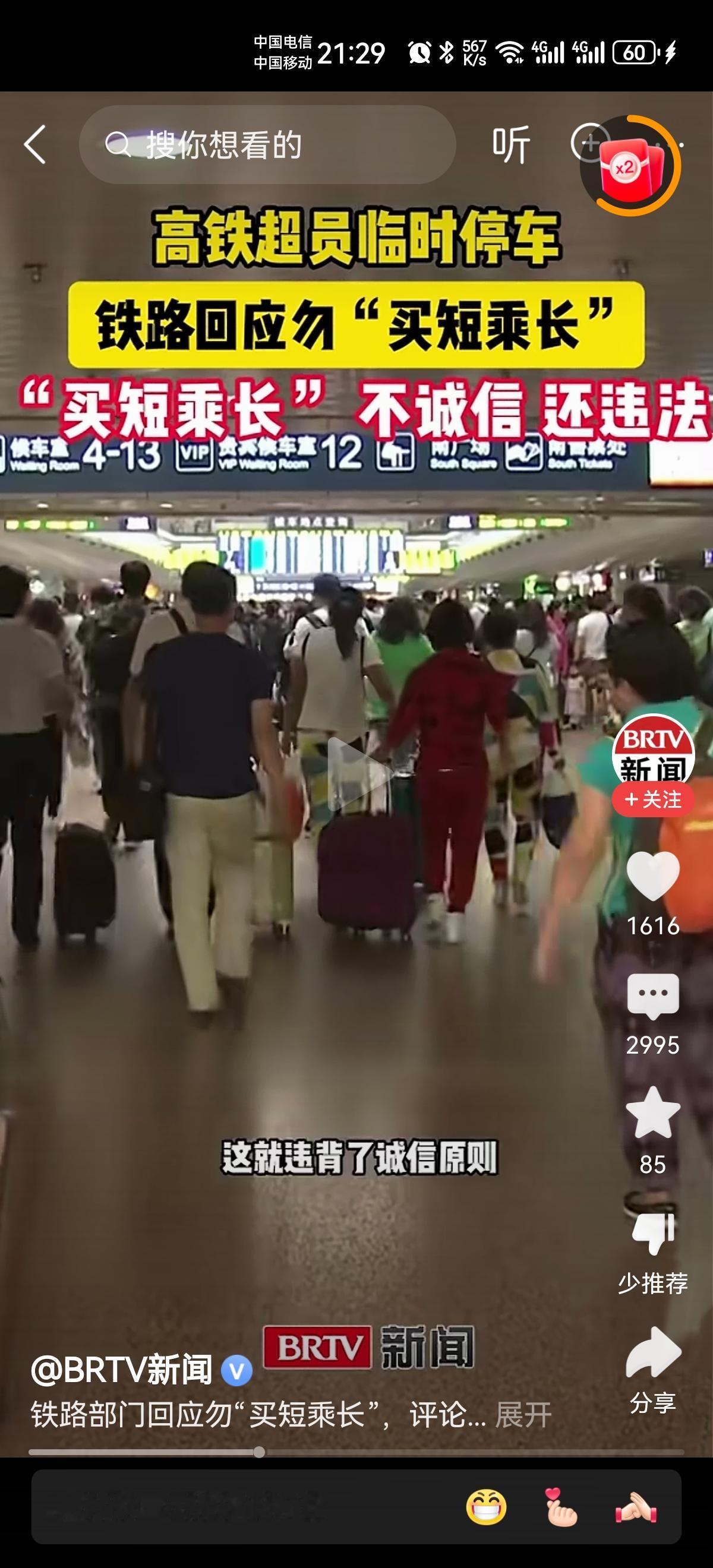 “买短乘长”涉嫌欺骗? “买短乘长”违背诚信原则? “买短乘长”违反治安管理处罚法? 那,请问, “买长程短”是不是也违法了? “买长乘短”是不是也涉嫌欺骗? “买长乘短”是不是也违反诚信原则? 这个问题12306得好好思考思考, 该怎么解决这个当前才常出现的问题? 该思考思考, 怎么样才不会出现这个问题? 该思考思考, 出现这个问题的乘车人员是什么导致的? 现在票一出,秒售罄? 真的售罄了吗? 买票为什么这么难? 候补? “买长乘短”随时有票, “买短乘长”也不一定好买呀。 加钱去其他平台买到票的几率还高些, 12306,“候补”的人心焦也未必能买到。 好不容易找到机会, “买短乘长”, 那下车后不补票能出站吗? 票这么难买, 原因是为何? 值得深思!火车买短乘长