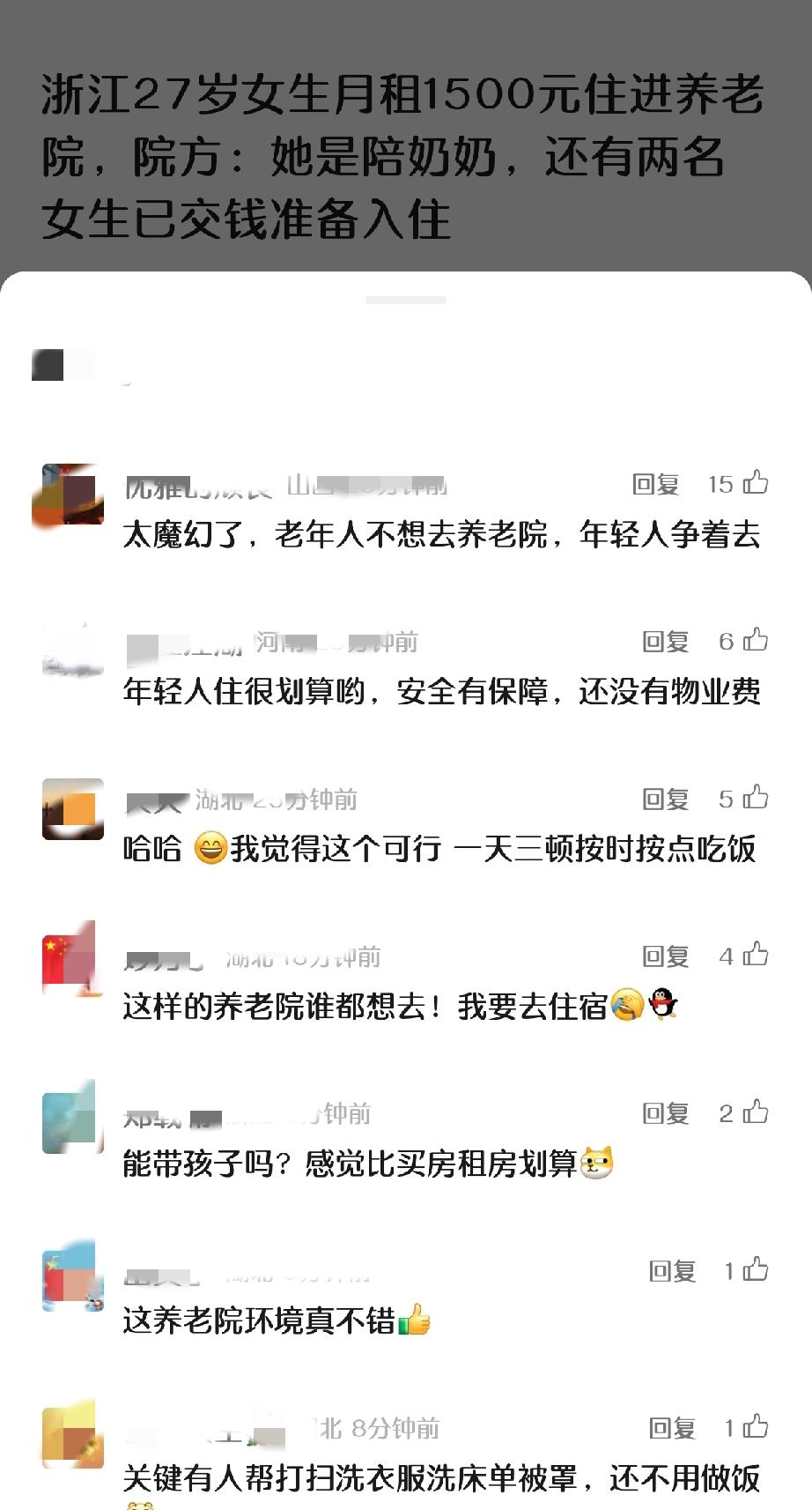 27岁女生入住进养老院 不但得到院方同意,还得到了网友一致好评 究竟是怎么回事?? 原来这位美女是受到了奶奶的影响 她奶奶住在养老院 觉得伙食、环境各方面条件都比较好 生活作息都比较规律 而且离孙女工作的单位也比较近 便咨询孙女是否愿意一起住进养老院 这位美女通过再三考虑 觉得一方面奶奶的提议不错 而且还能照顾奶奶 于是便跟院方商量,住进了养老院 养老院方面觉得一方面因为是新开的 空房比较多,也能方便孙女照顾奶奶 便特意降价,以1500每月租一间房给这个美女 并且特意安排在奶奶隔壁 没想到,此举竟得到了网友的一致好评 甚至有很多网友报名要入住养老院 院方也特意把总共6层的楼,拿了一层开放给年轻人入住 但院方也强调,希望入住者工作稳定、素质较高,不会影响到老人家生活、安全问题! (消息来源:极目新闻)