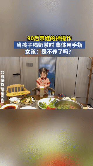 饭桌上,小女孩正想喝桌上的奶茶,突然好几只手一起指向她。小女孩瞬间懵了,一脸疑惑