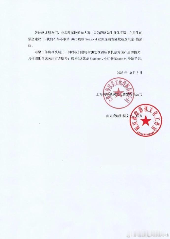 鹿晗工作室发布“因身体不适,取消吉隆坡和东京巡回演唱会” 想到了张学友重感冒坚持