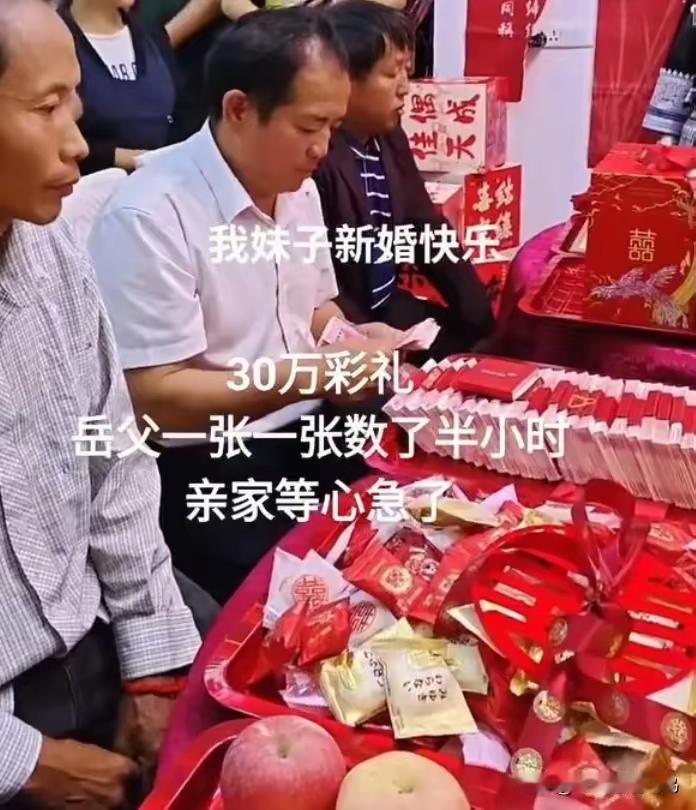 订婚现场,老丈人一张一张地清点着彩礼,新郎坦言:“数了30多分钟,挺尴尬的。” 亲家见面,本应是一派喜气洋洋的景象,可一到彩礼环节,气氛便急转直下。前一分钟大家还热热闹闹,互相称赞女儿乖巧懂事、男孩有责任有担当,红包一摆上桌,空气瞬间安静了不少。 这订婚现场的一幕,展现出彩礼环节在传统婚礼中独有的氛围,也揭示了彩礼背后潜藏的压力与复杂情感。 从描述中能看出,老丈人数彩礼用了30多分钟,场面稍显尴尬。原因或许如下: 彩礼金额带来的压力:长时间数钱会让现场气氛变得紧张,尤其是彩礼金额较大,或者双方家庭对金额的预期存在差异时。 情感与理性的冲突:原本沉浸在喜庆氛围里,突然开始核算彩礼,容易让气氛变得拘谨,甚至尴尬。 传统与现代的矛盾:部分家庭更看重彩礼的象征意义,而年轻一代可能觉得这既繁琐又多余。 红包上桌后气氛安静,反映出彩礼金额或方式可能带来的压力,也可能是大家对这份礼物极为重视,让现场变得更加正式庄重。 这类场景在很多地方并不少见,体现了婚姻中传统习俗与现代价值观的碰撞,也引发了关于彩礼合理性、家庭关系和婚姻观念的探讨。