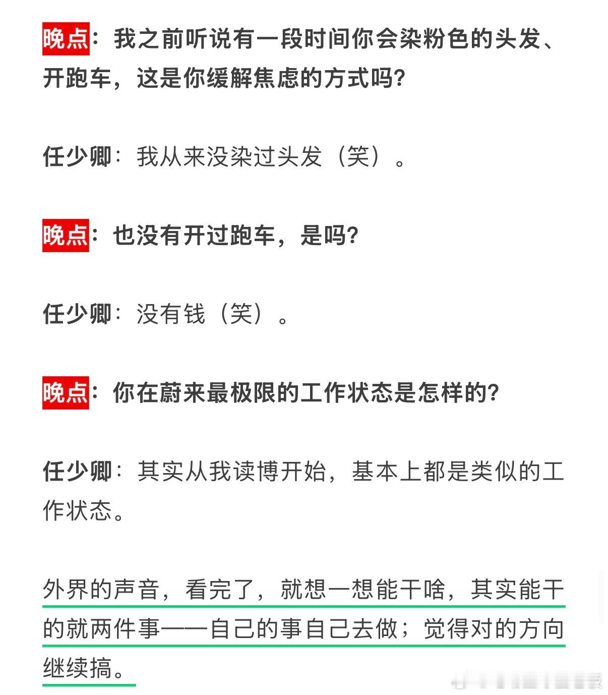 而任少卿这次出来接受访谈,其实潜藏着两个回应。1、对此前被传离职风风雨雨的再回应;2、跟群里部分朋友聊天时说的那样:任少卿都出来说话,离交货不远了。