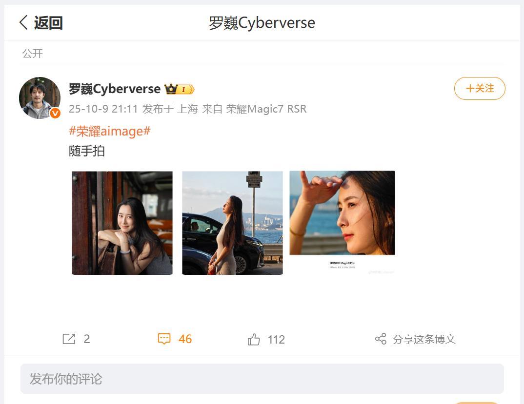 荣耀的人像能力一直很顶,对于荣耀Magic8 Pro新品旗舰来说,随手拍人像也是小意思,刚刚看到荣耀首席影像工程师罗巍,分享了一组利用这款机型,随手拍的人像照片,色彩蛮自然,前景与背景过渡也蛮好,人像光影堪比单反和定焦镜头,果然靠谱 #万能生活指南##畅聊数码新品##数码资讯#